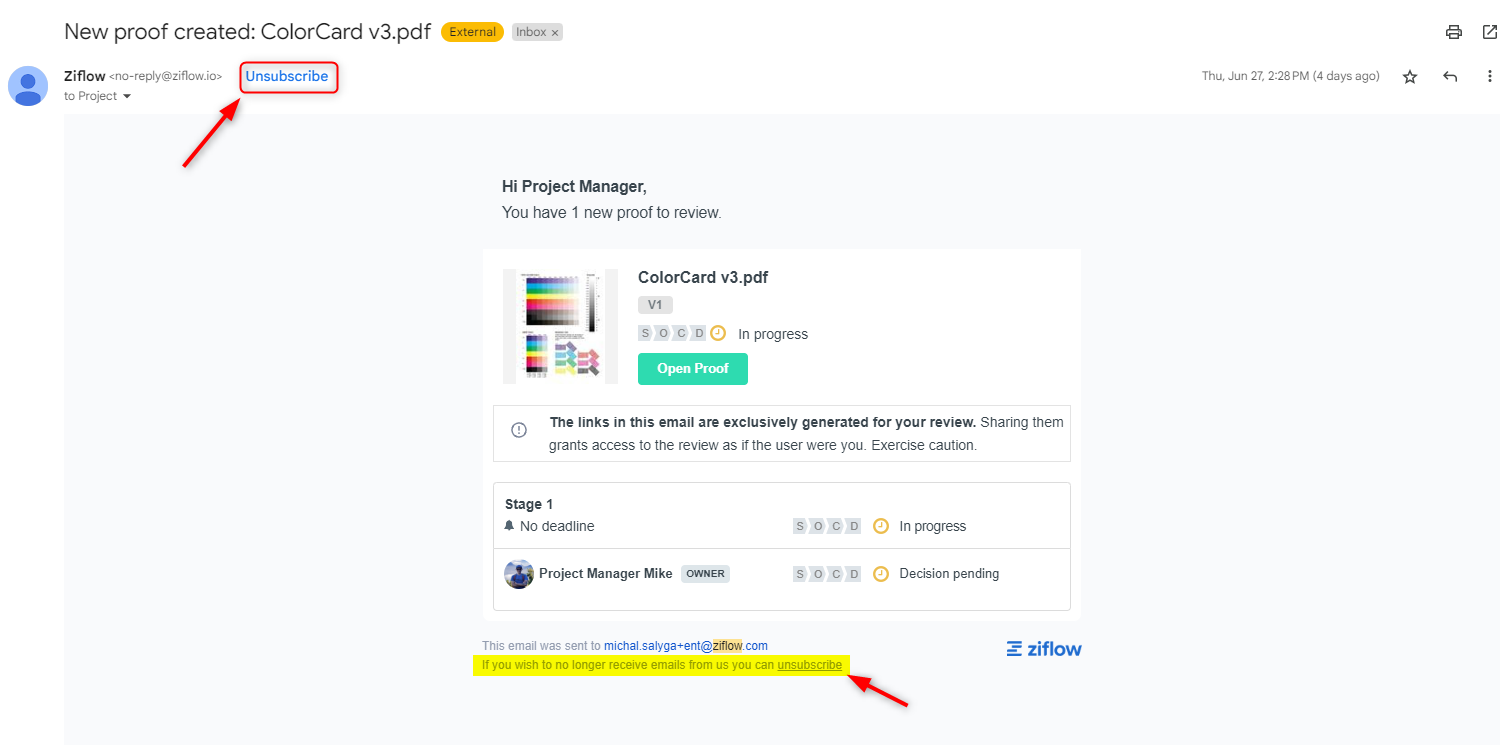To stop receiving Ziflow emails and notifications, simply open any email from Ziflow and click the Unsubscribe button.