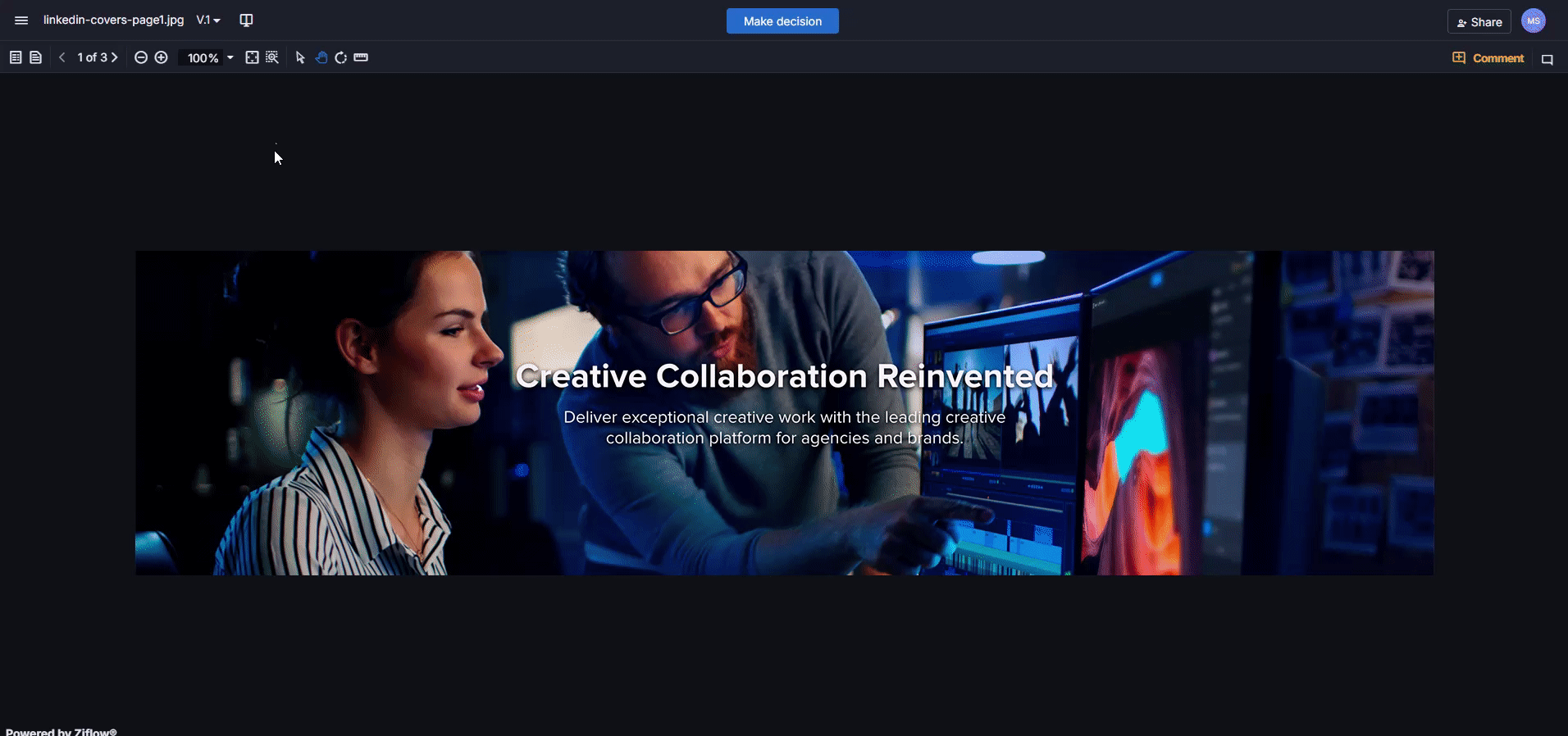 We've enhanced the Ziflow Viewer to maintain the "Fit to..." zoom ratio when reviewers switch pages or use compare mode. This comes in handy, especially when reviewing proofs that contain multiple files with different file dimensions.