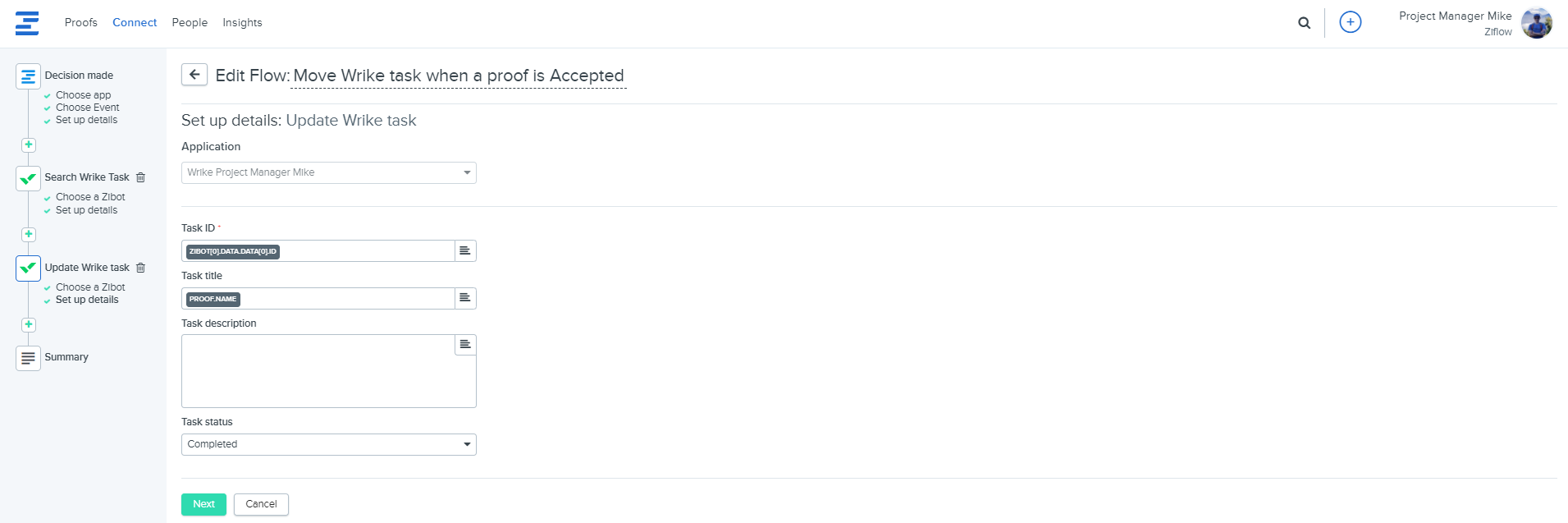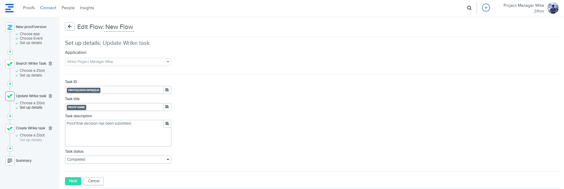 4. Update Wrike task - with this Zibot, you can update the Wrike task with changes from Ziflow:
