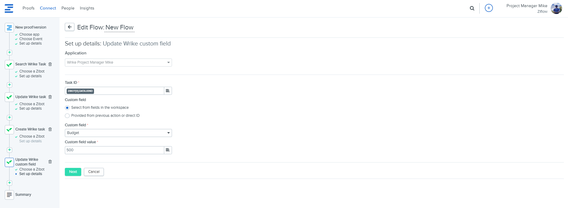 5. Update Wrike custom field - with this Zibot, you can update the values of custom fields added to specific tasks.