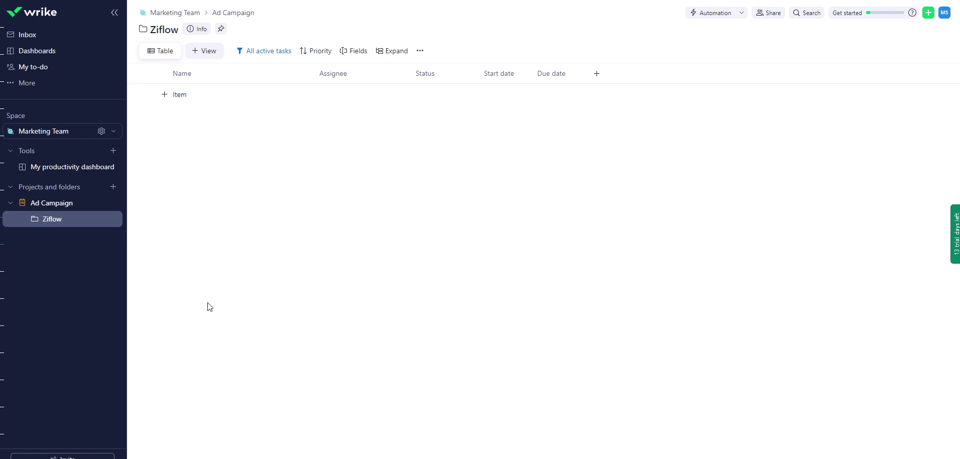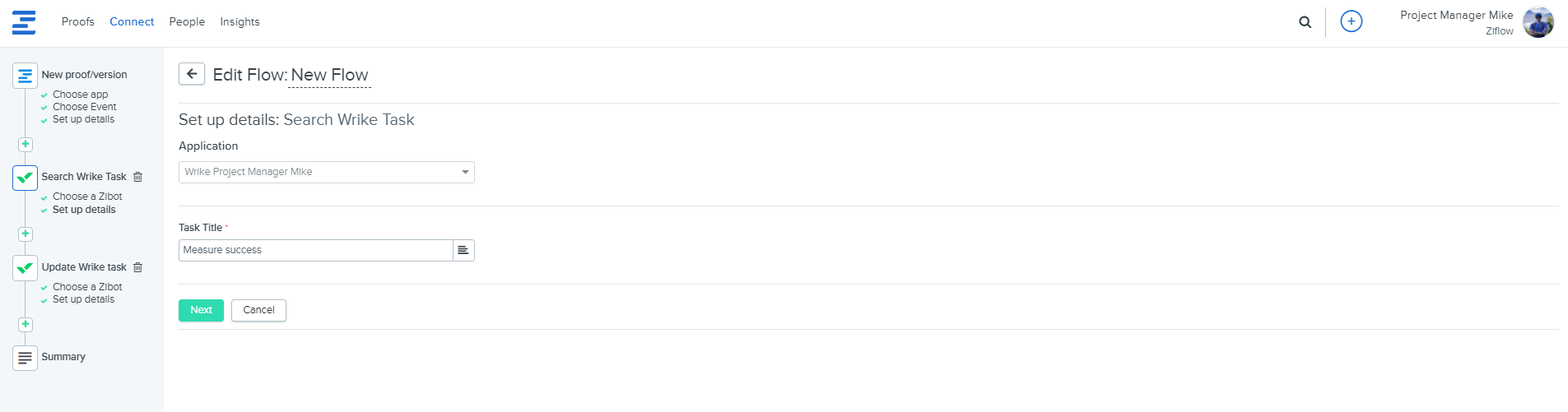 Once Ziflow is connected to Wrike, you can seamlessly set up Wrike flows. With this flow example implemented, any newly created proofs in Ziflow will automatically trigger a corresponding flow, effortlessly adding tasks on the Wrike end.
