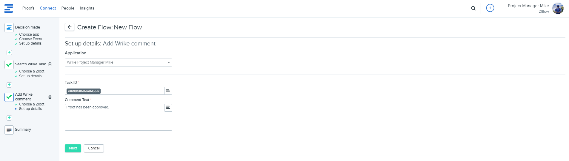3. In the next step, you'll need to add the Add Wrike comment Zibot. Inside the Task ID field, please select a token containing the Wrike task ID from a previous Zibot. In the comment text field, I decided to enter a token that will contain a proof ID so I can reach out to Ziflow support if needed.
