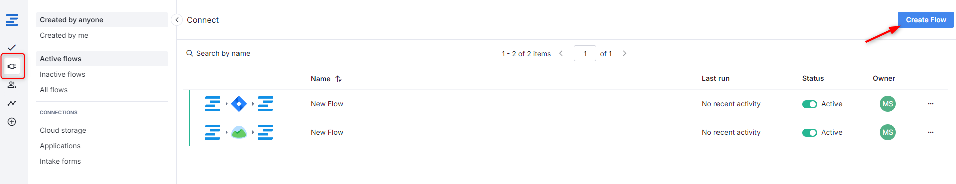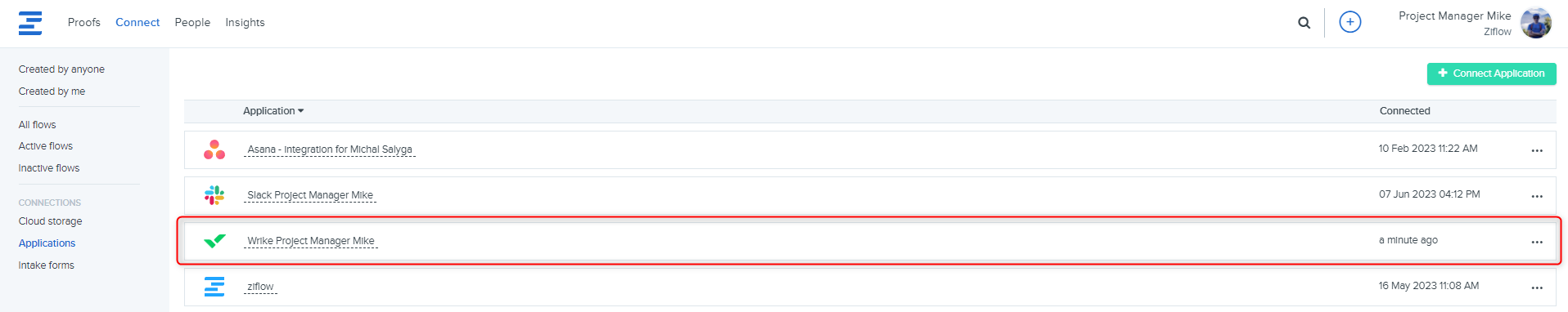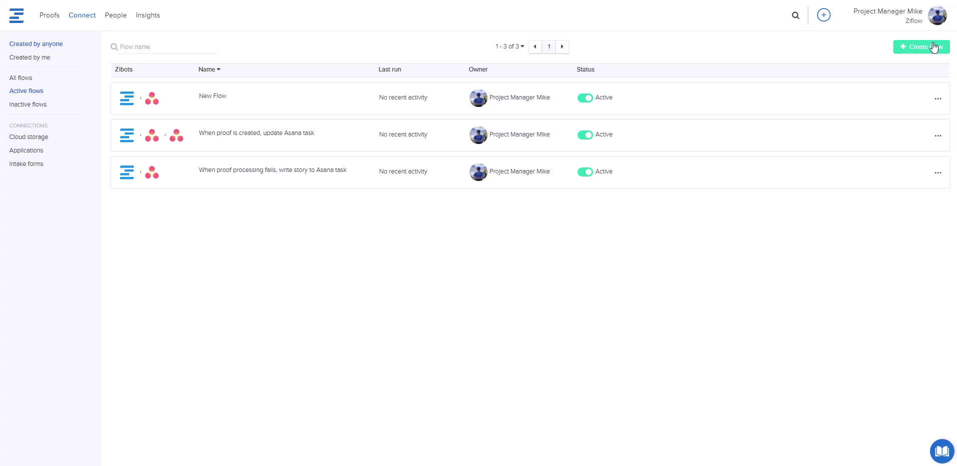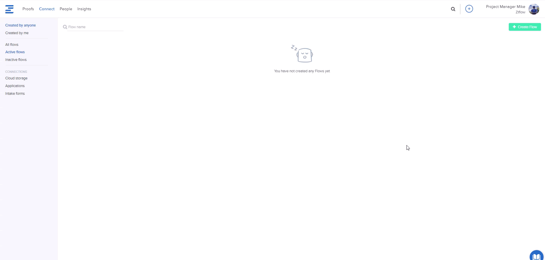 Once Ziflow and Wrike are connected, you can begin setting up automated flows to send information to Wrike. Start by going to the Connect tab and by clicking on the Create Flow button in the upper right corner of the screen.
