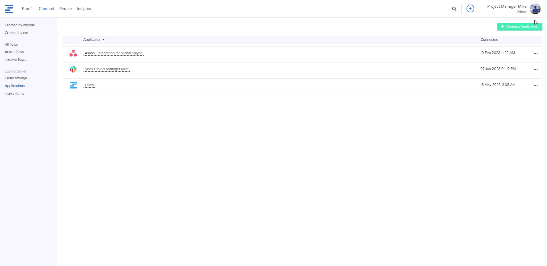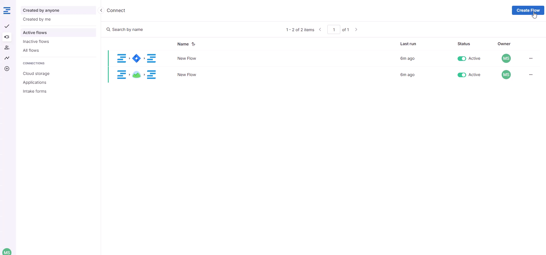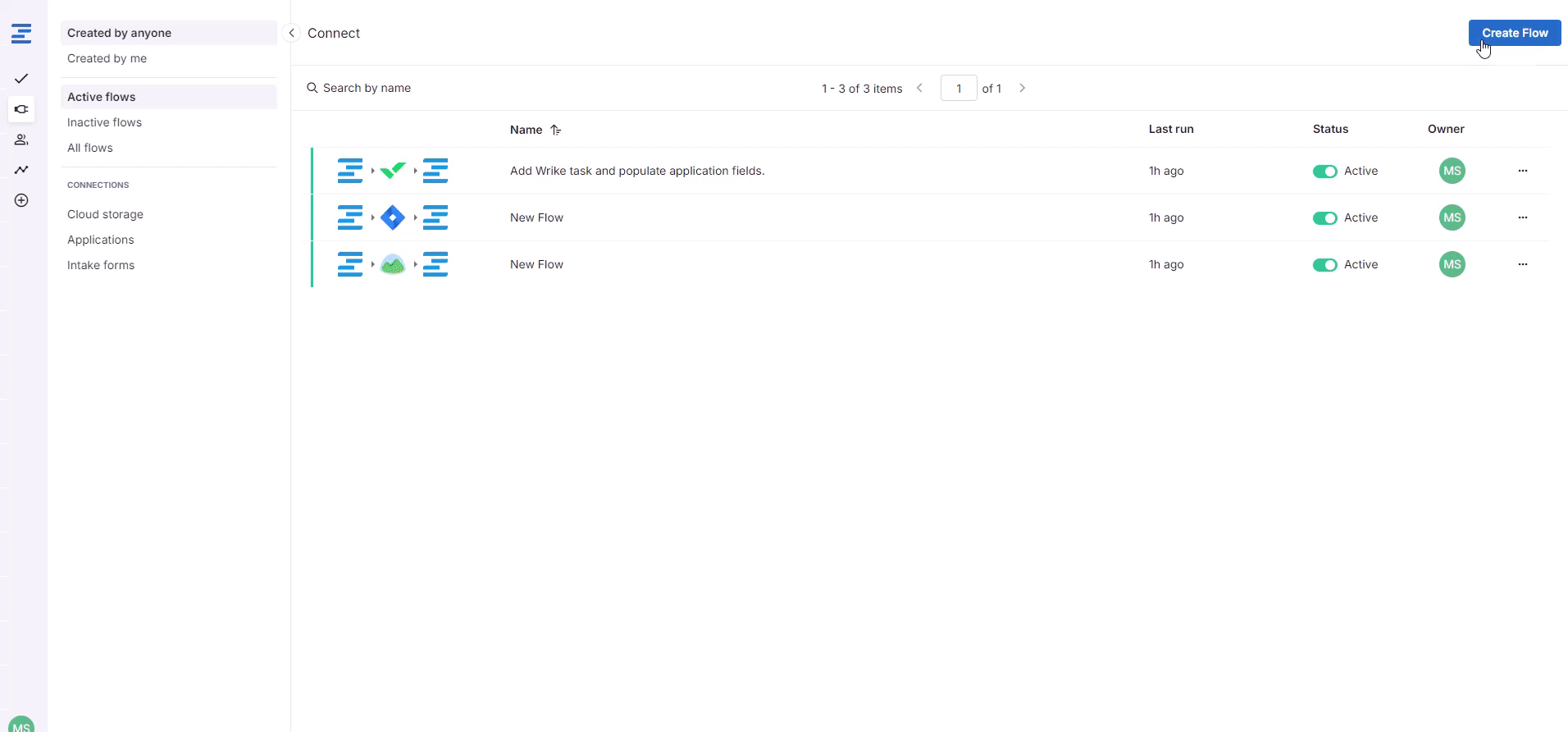 Once Ziflow and Wrike are connected, you can begin setting up automated flows to send information to Wrike. Start by going to the Connect tab and by clicking on the Create Flow button in the upper right corner of the screen.