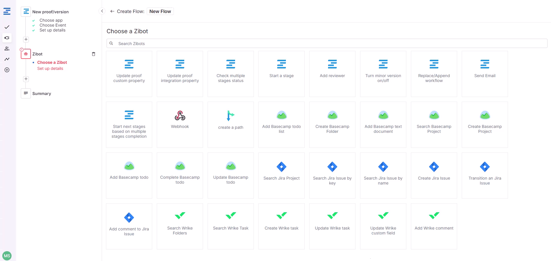 1. Create a new flow and select the needed event trigger. In this case, it will be a New Proof/Version. You can narrow down proofs that will trigger the automation by configuring event settings. In my case, each failed proof in Ziflow should trigger the Wrike flow.