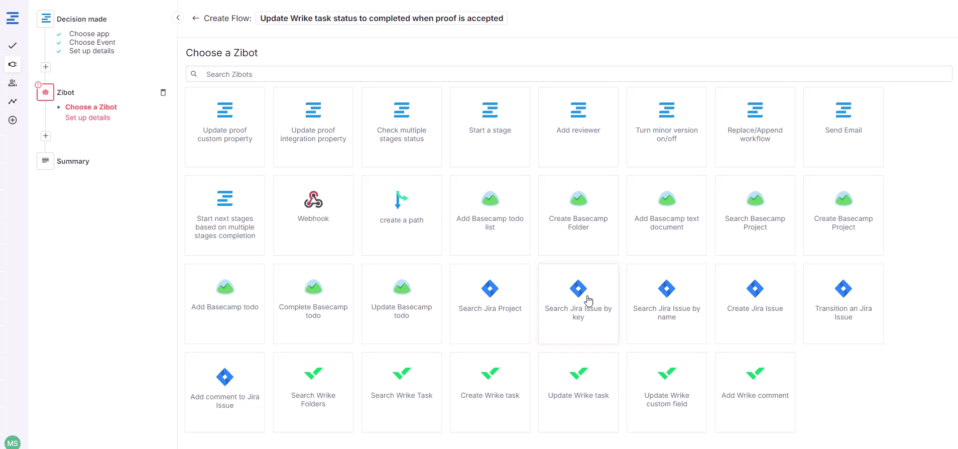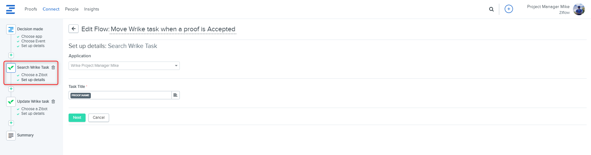 2. Add the Search Wrike task Zibot. For the query field, please select PROOF.NAME from a token selector.
