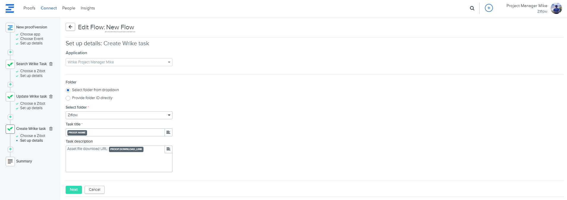 2. Add the Create Wrike task Zibot to your flow. Inside the Zibot configuration, select the folder where the task should be automatically added and also specify what should be entered in a task title field and in the task description.