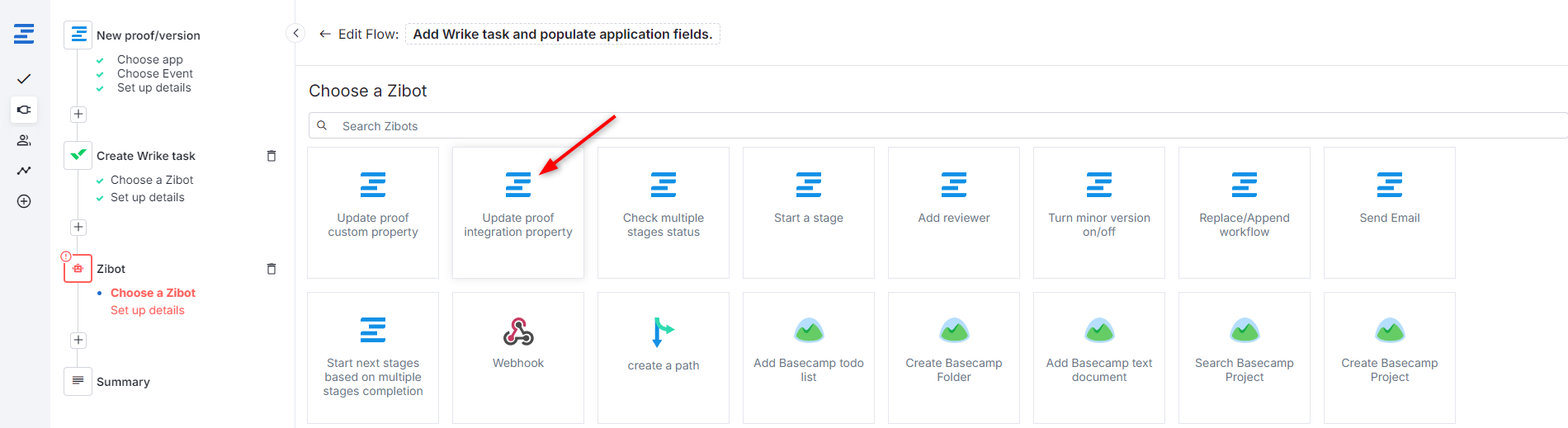3. Next, you must add two internal Ziflow Zibots (Update proof integration property). They aim to populate the application fields (Project ID & Task ID) of a newly created proof with information sourced from Wrike.