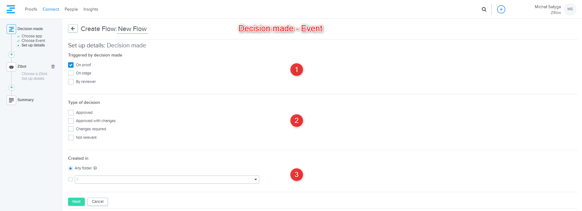 Create a new flow with Ziflow as application and select The Decision made as an event trigger