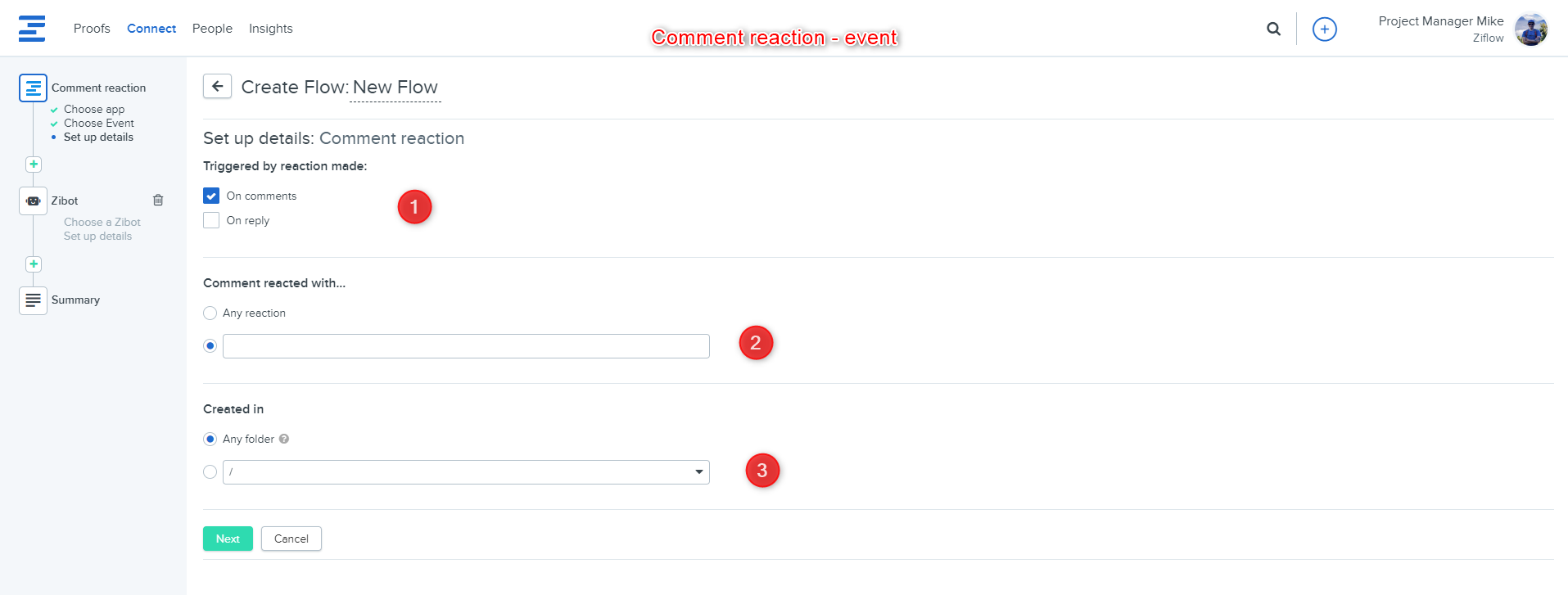 1. Triggered by - choose if you want to trigger a flow based on reactions added to comments or replies.