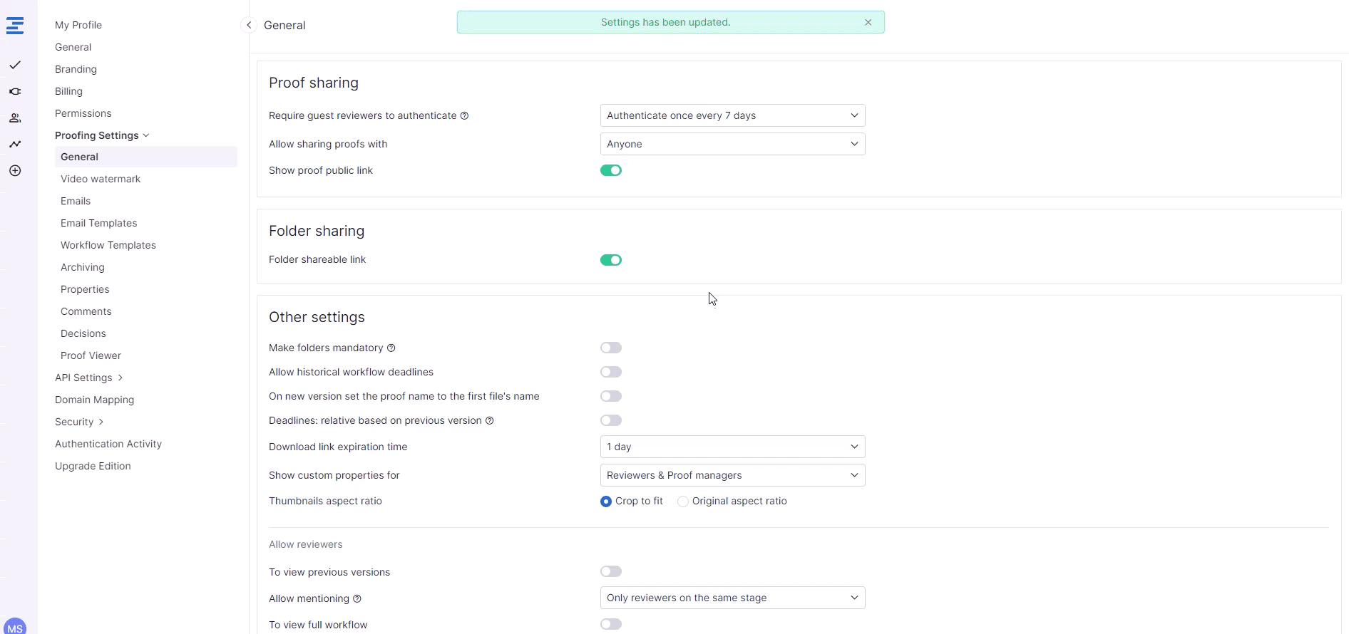Note: this setting will only apply to a proof’s thumbnail image in Ziflow’s Dashboard; images in the “more proofs to review” modal, email notifications and hourly digests, and other areas of the software where thumbnails are displayed will retain the “crop to fit” behavior.