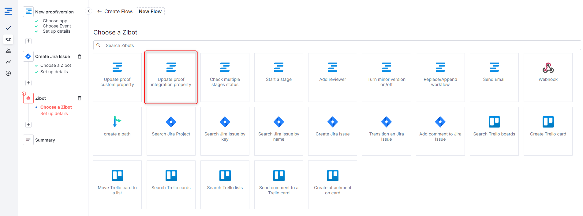 4. Next, you must add three internal Ziflow Zibots (Update proof integration property). They aim to populate the application fields (Workspace ID, Project ID & Issue ID) of a newly created proof with information sourced from Jira.