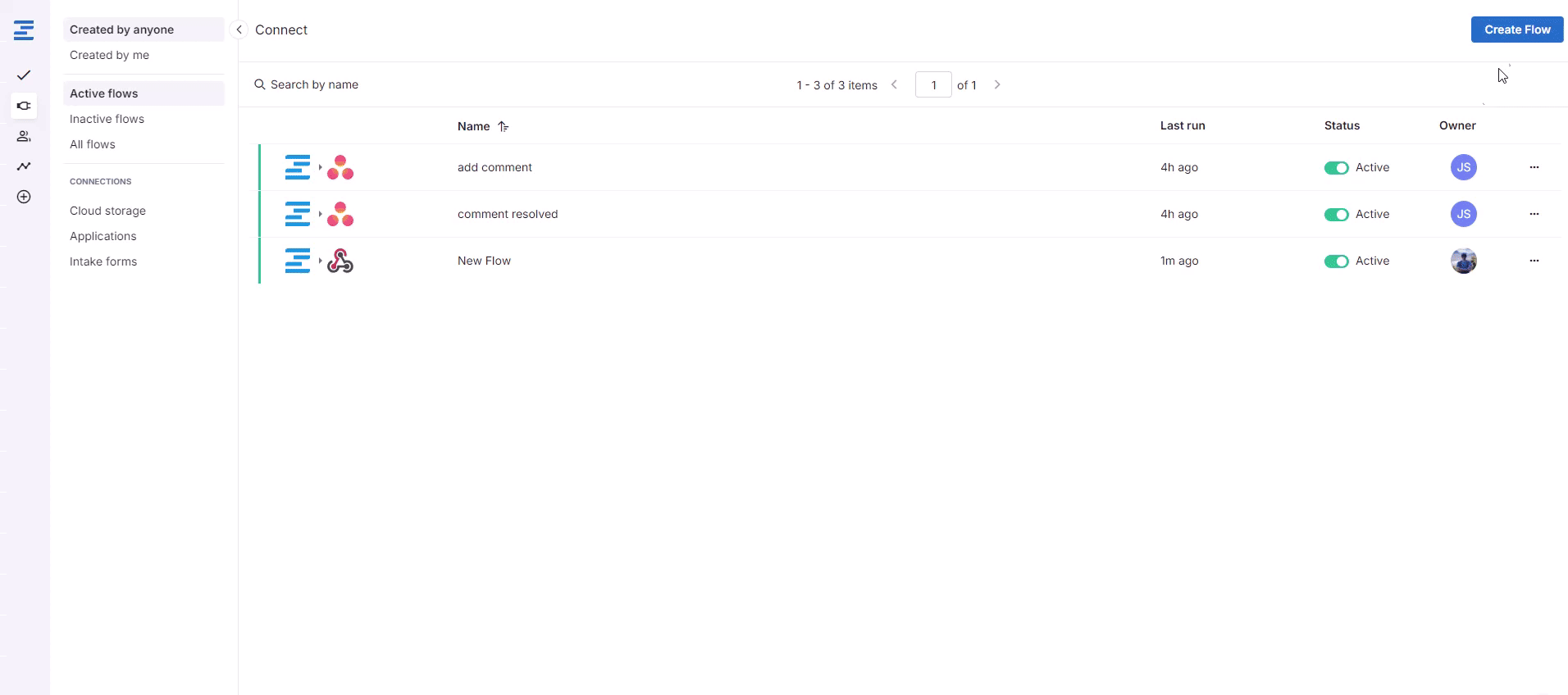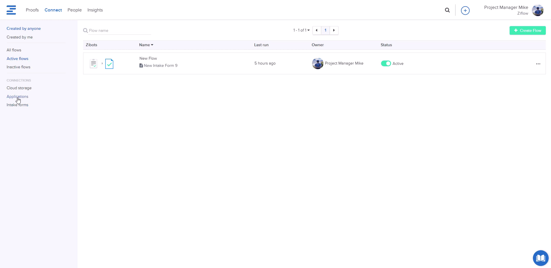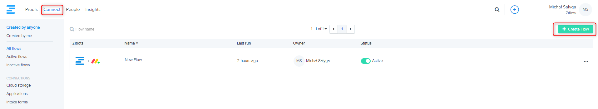 Once Ziflow and Jira are connected, you can begin setting up automated flows to send information to Jira. Start by going to the Connect tab and by clicking on the Create Flow button in the upper right corner of the screen.
