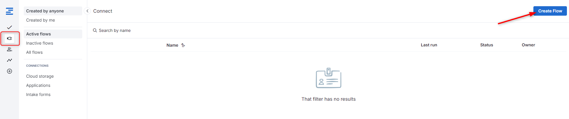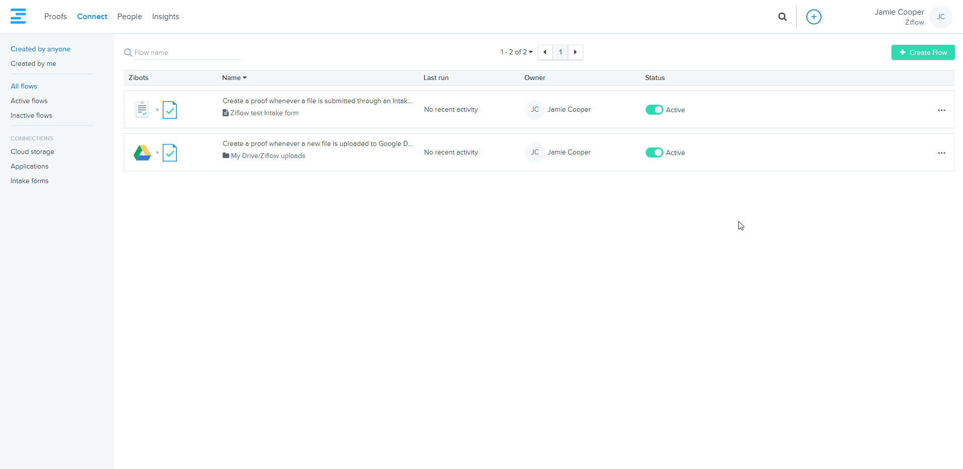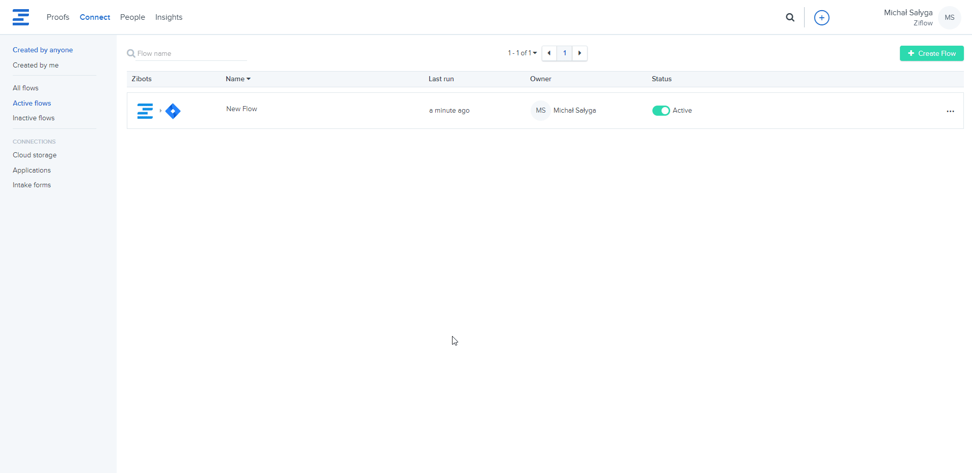 Once Ziflow and Jira are connected, you can begin setting up automated flows to send information to Jira. Start by going to the Connect tab and by clicking on the Create Flow button in the upper right corner of the screen.