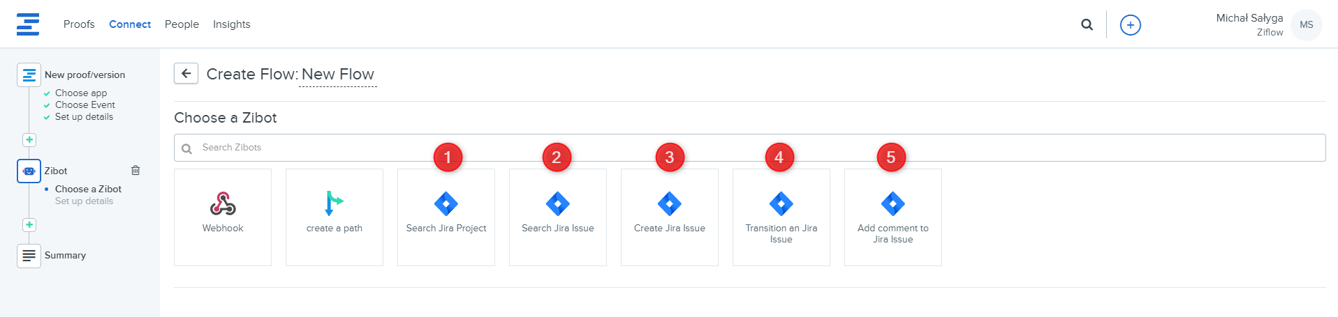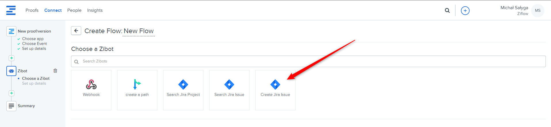 After saving the event flow triggers, choose a Jira Zibot action that will pass the information set in the previous step directly to Jira:
