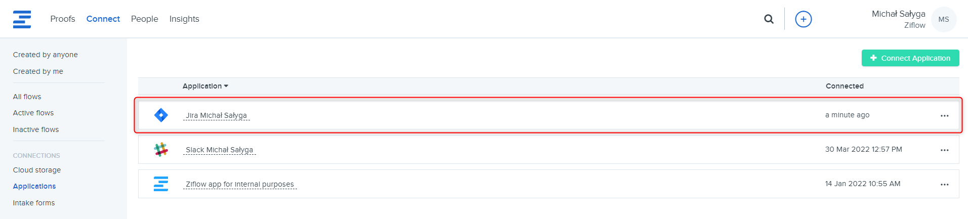 To integrate Jira with Ziflow, open the Connect tab in the Ziflow account and then click on the Applications tab on the left. Once inside the Applications menu, click on the Connect Application button and select Jira from the list.