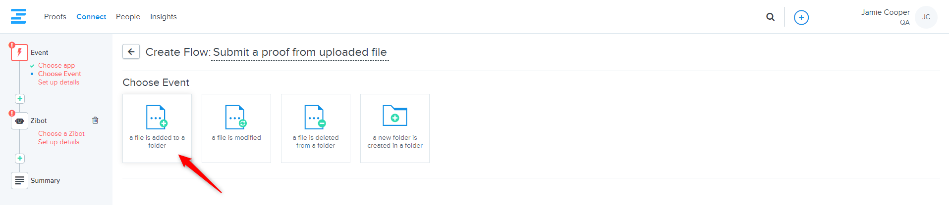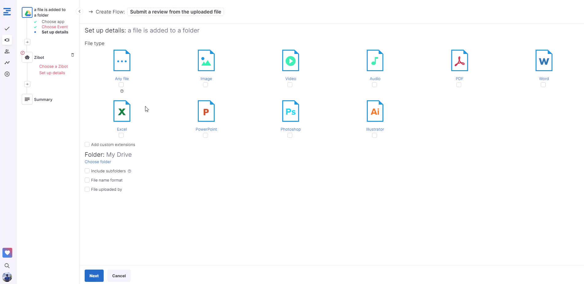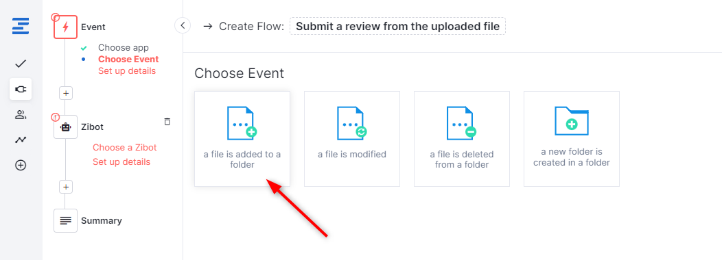 Next, choose the event that will trigger your Zibot. In this, I’m choosing “a file is added to a folder”.