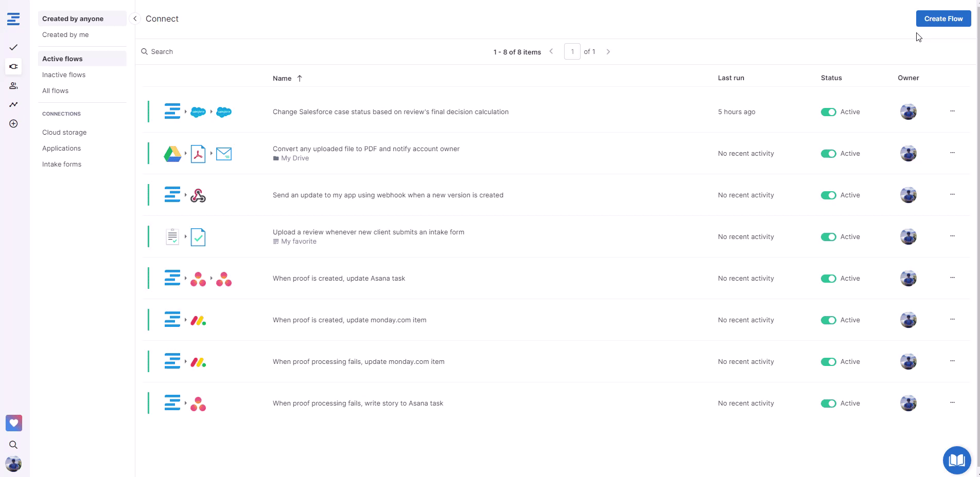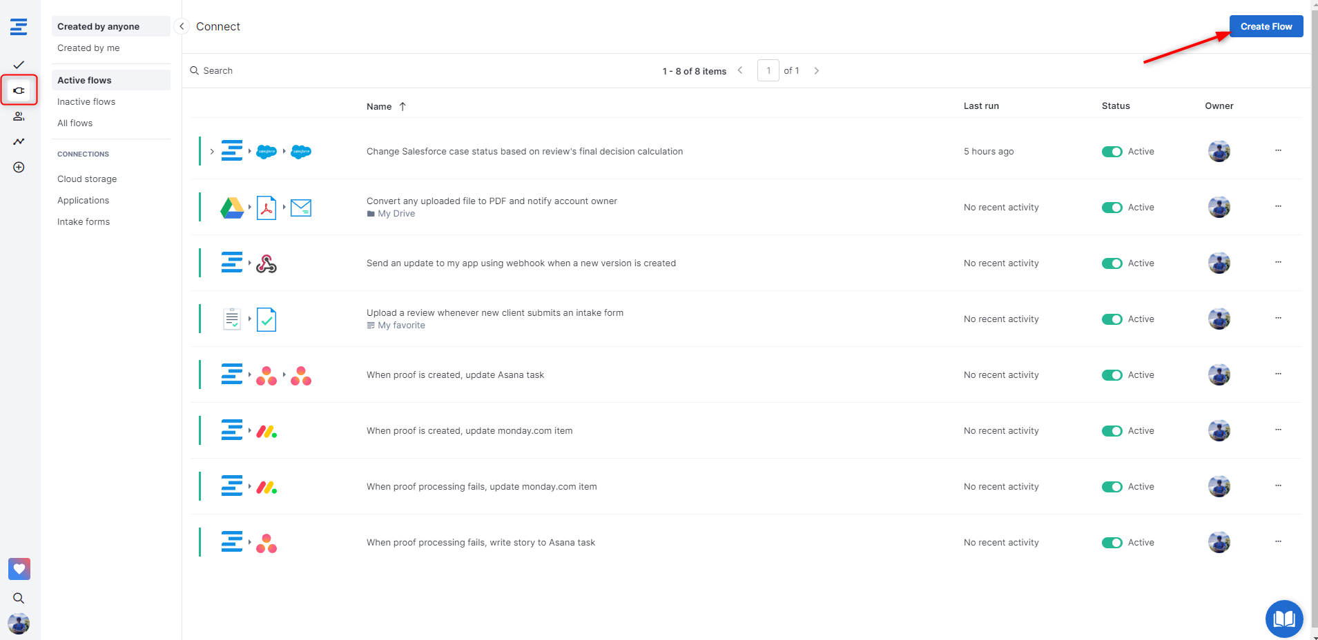 Once your first intake form is ready, follow the steps below. You start by clicking on the Create flow button inside the Connect tab: