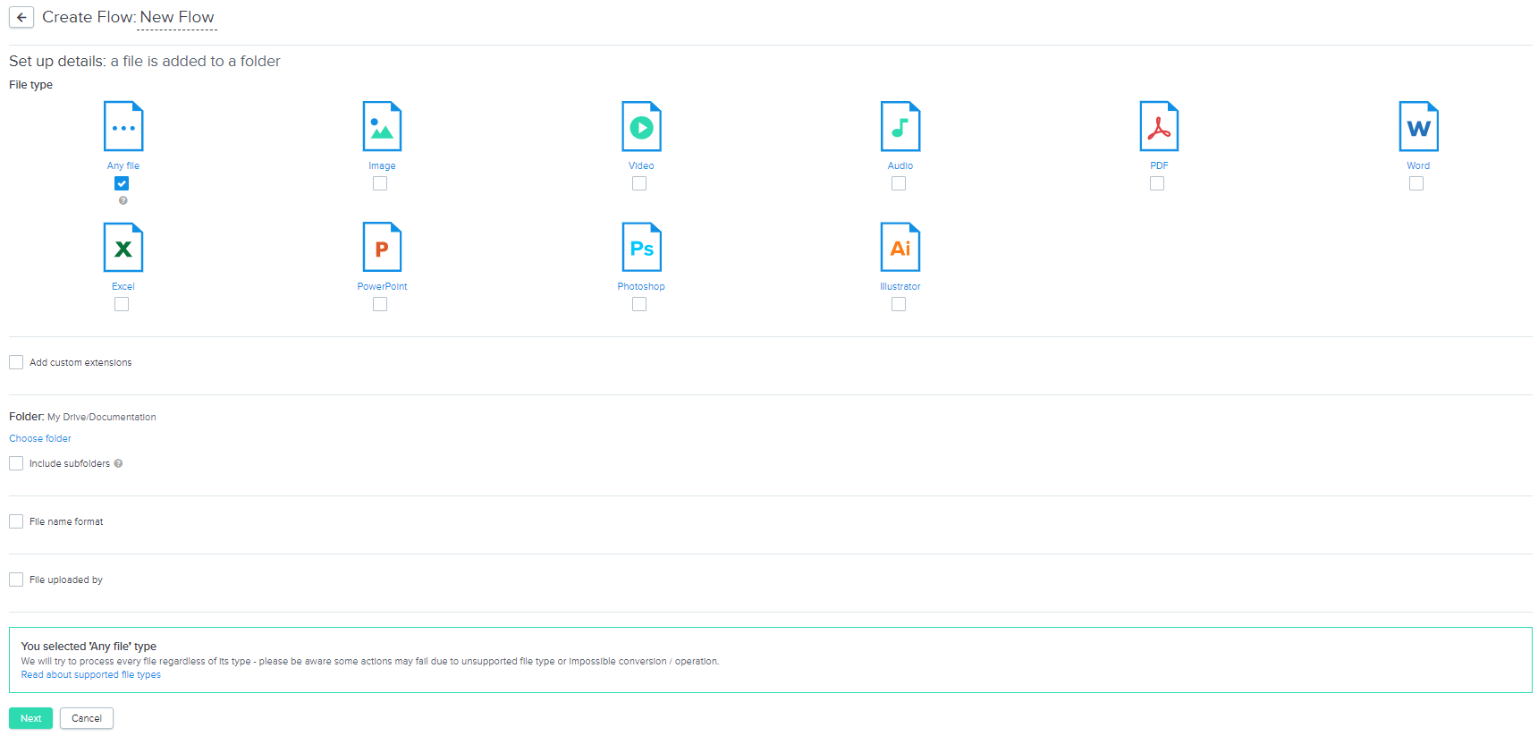 The settings above let you narrow down files that will trigger the automation later on. You can decide which files, uploaded, where and by whom will trigger later actions.