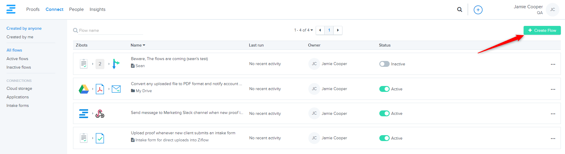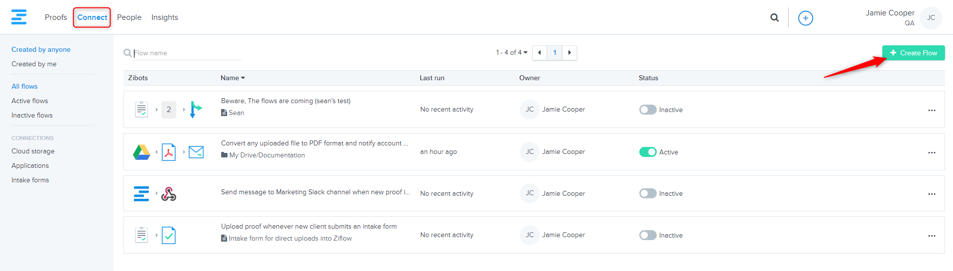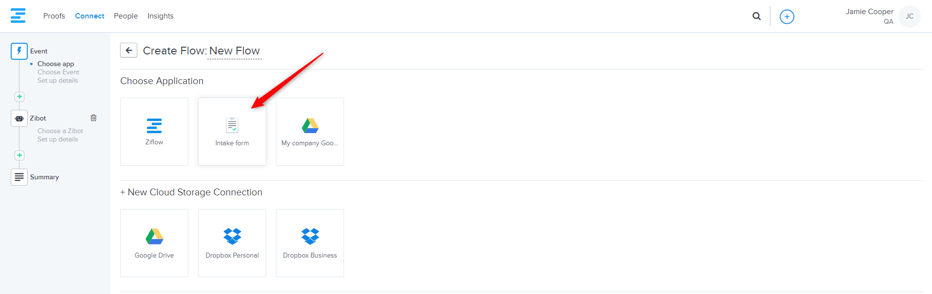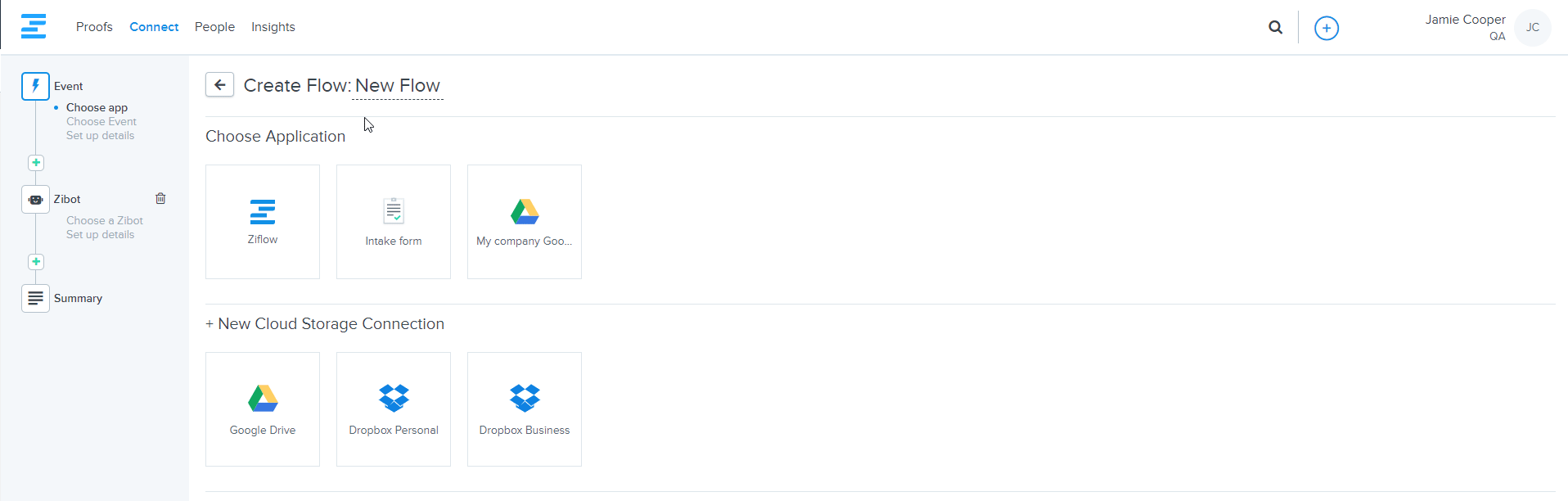 Click on the Connect tab in the upper left corner of the screen, then click on the Create flow button. Instead of connecting to cloud storage, select the Ziflow application.