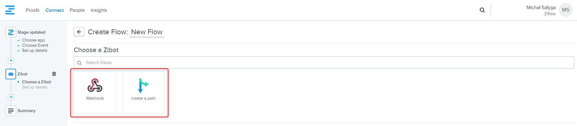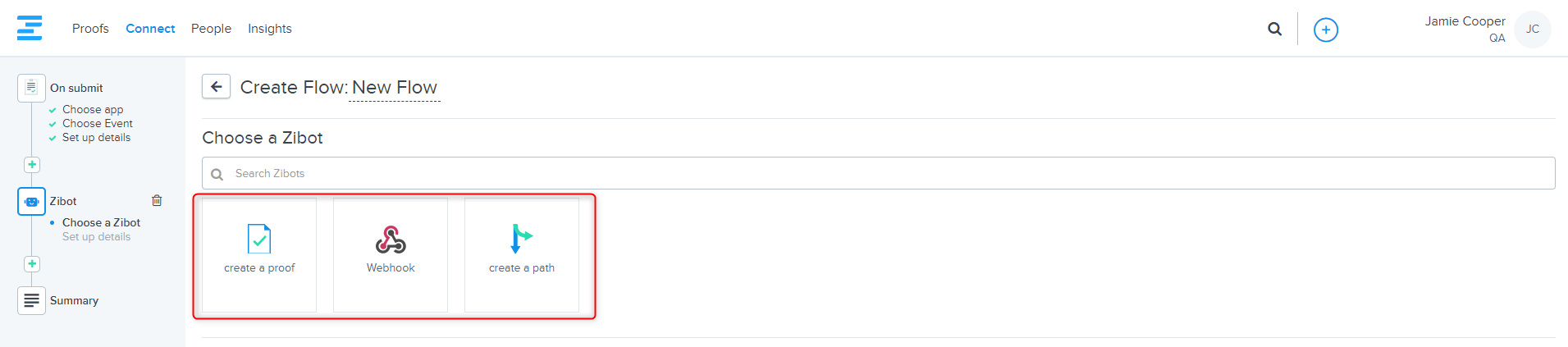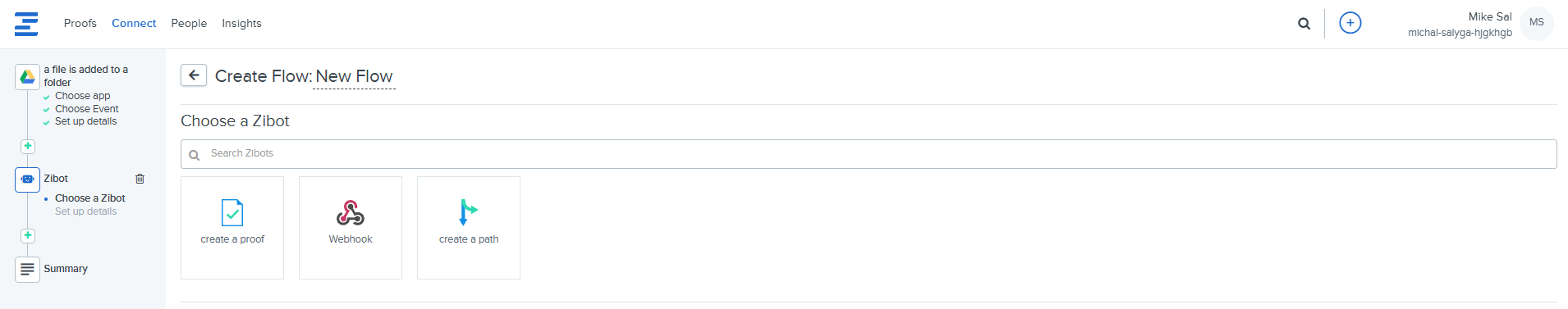 Select the needed Zibot that will automatically execute an action once a flow is triggered. In this help page, we'll use a create a proof Zibot, but if you want to check other Zibot configuration settings, please visit the following website.