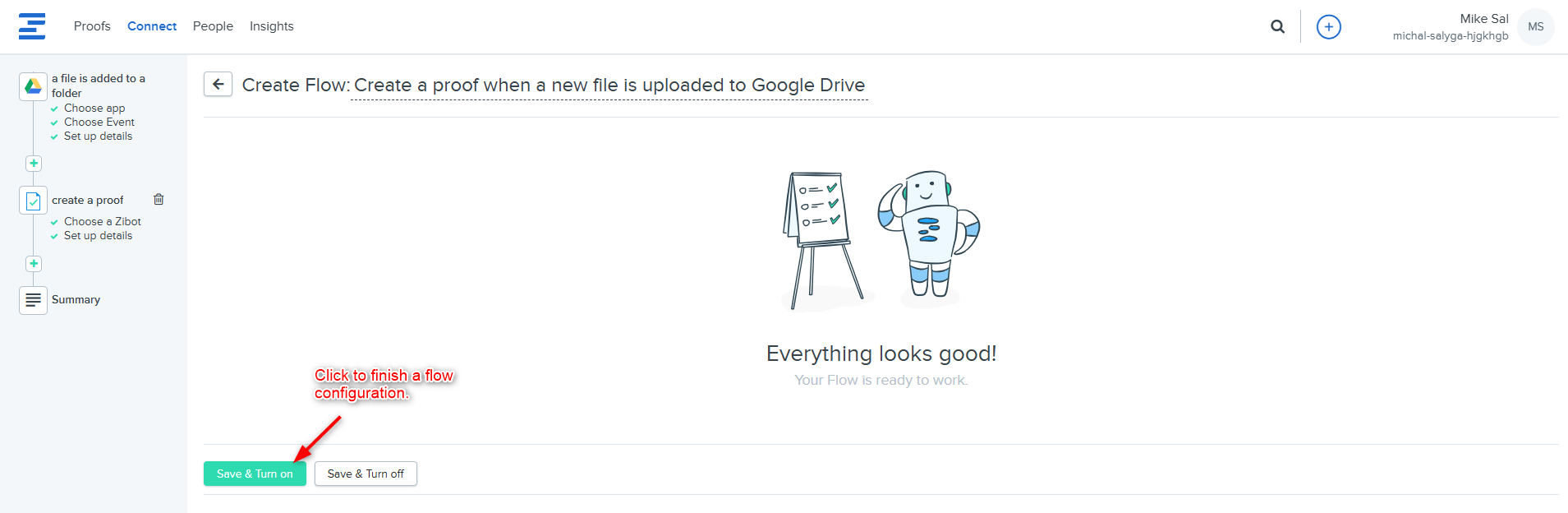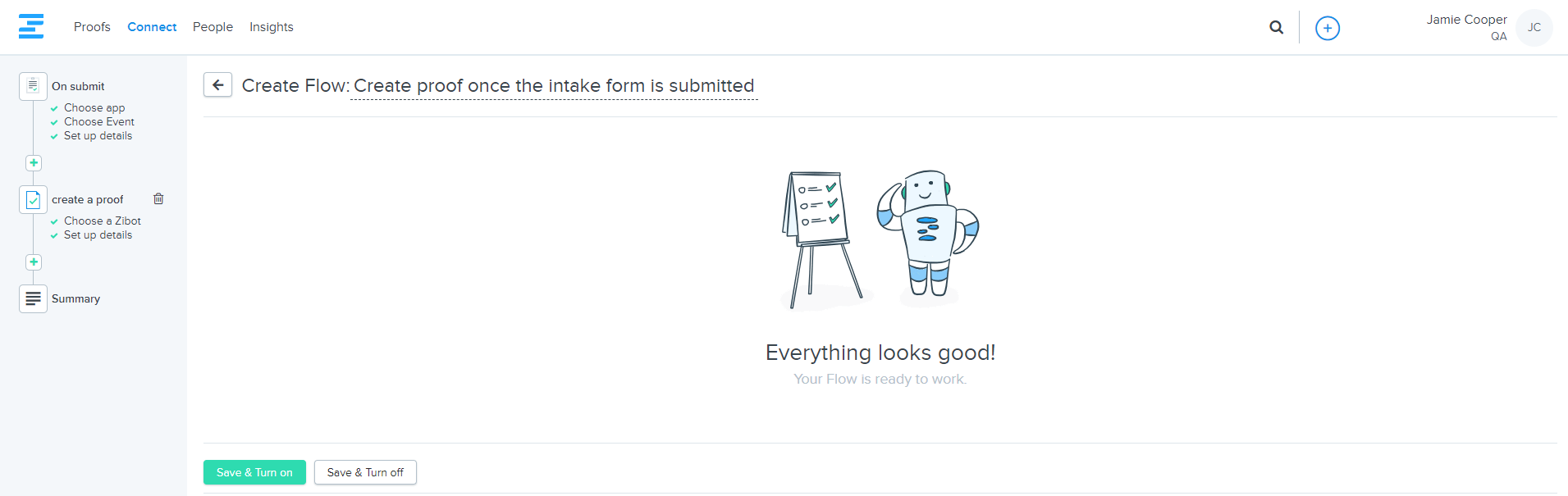 Once you hit the Next button, Ziflow will confirm if the flow looks good. If there are no problems, name the flow and turn it on.