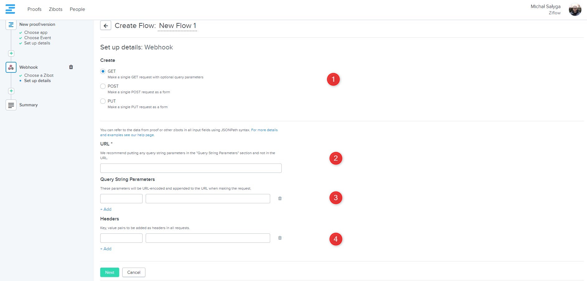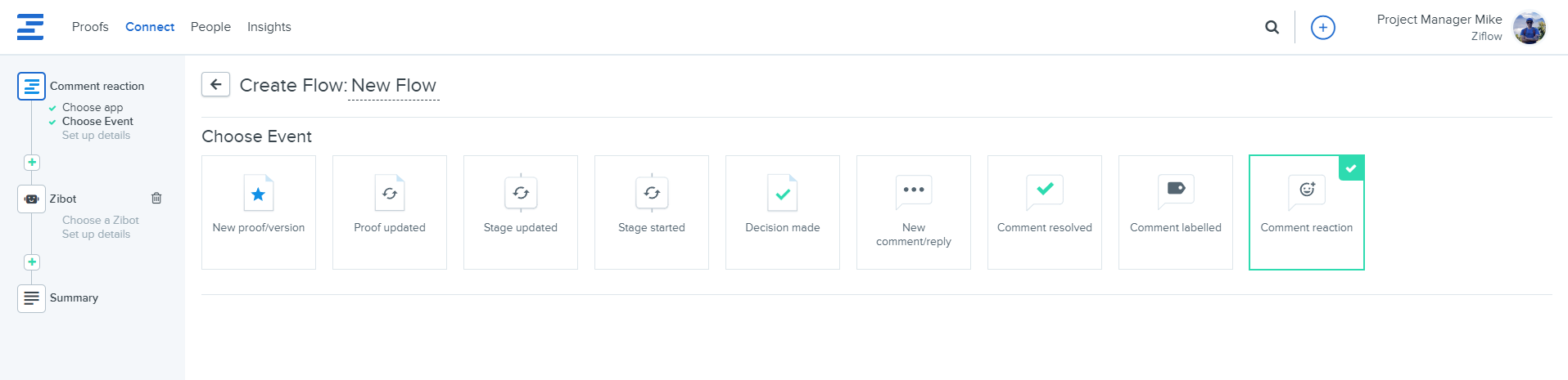 Once you’re done with the event configuration, you can proceed to set up an actual Zibot that is going to create proofs, send a request to a third-party app or create a path: