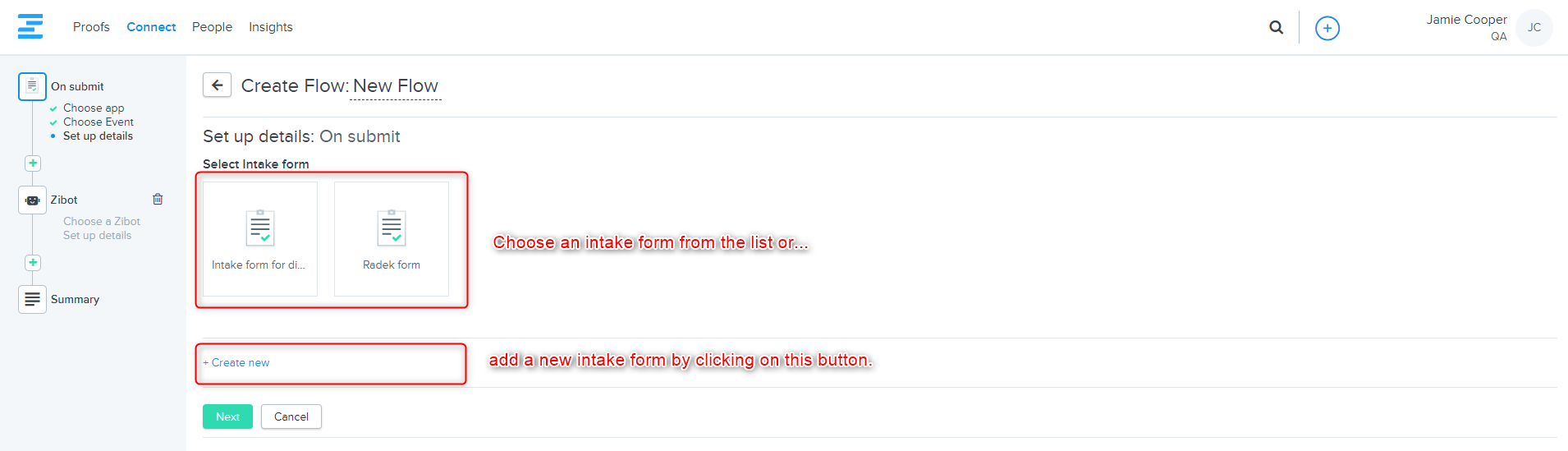 To create an intake form and add a flow, see Use intake forms for automated proof creation.