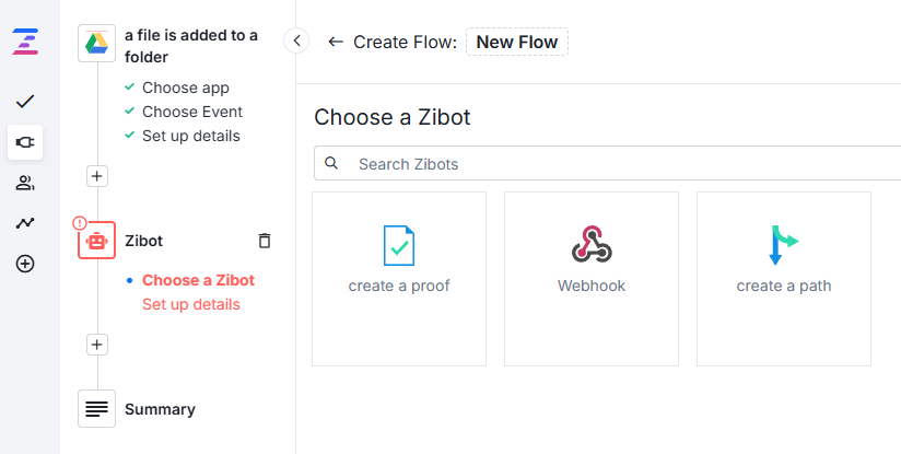 Select the Zibot, which will automatically execute an action once a flow is triggered. In this help page, we'll use a create a proof Zibot, but if you want to check other Zibot configuration settings, please visit the following website.