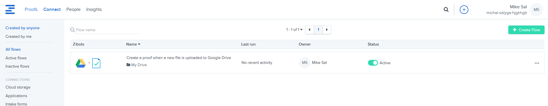 **NOTE - you must first connect your cloud storage (Dropbox or Google Drive) before creating a flow. You can do this under the "Connect" tab -> Cloud Storage. If you need a detailed guide on how to connect with your cloud storage, please visit this website.
