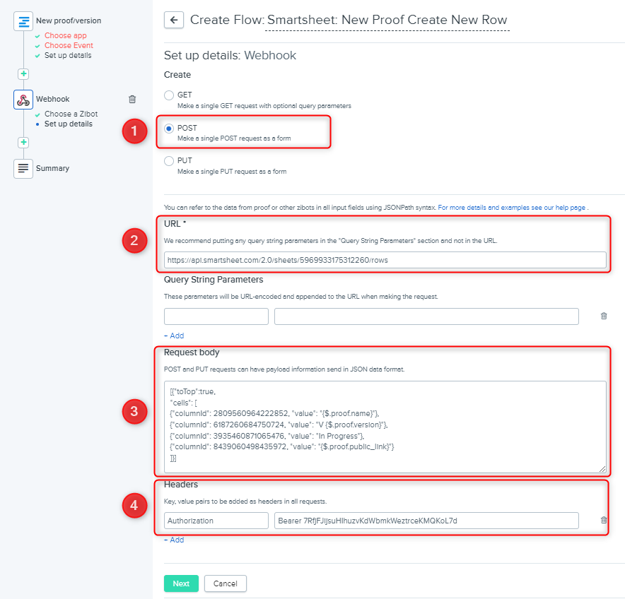 Request body - should be filled with JSON body referencing columns that you would like to update in Smartsheet with data from Ziflow. In this case, I decided that the row on the Smartsheet side should be updated with four fields from Ziflow: Status, Version & Proof Link URL.