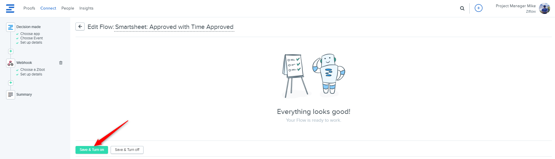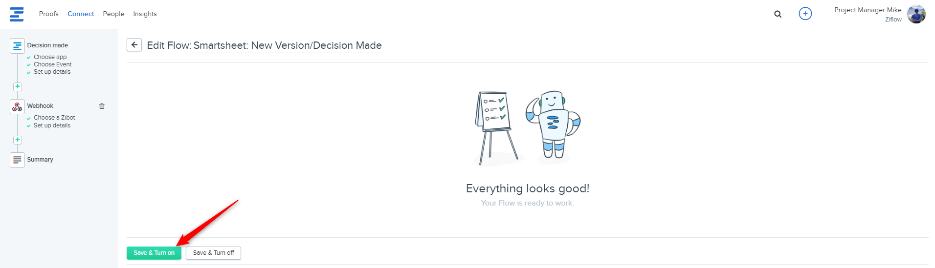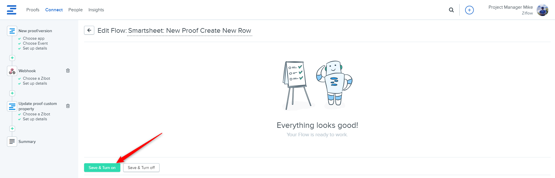 You can test if the flow works correctly by creating a sample proof in Ziflow and then checking if it added a record in Smatsheet.