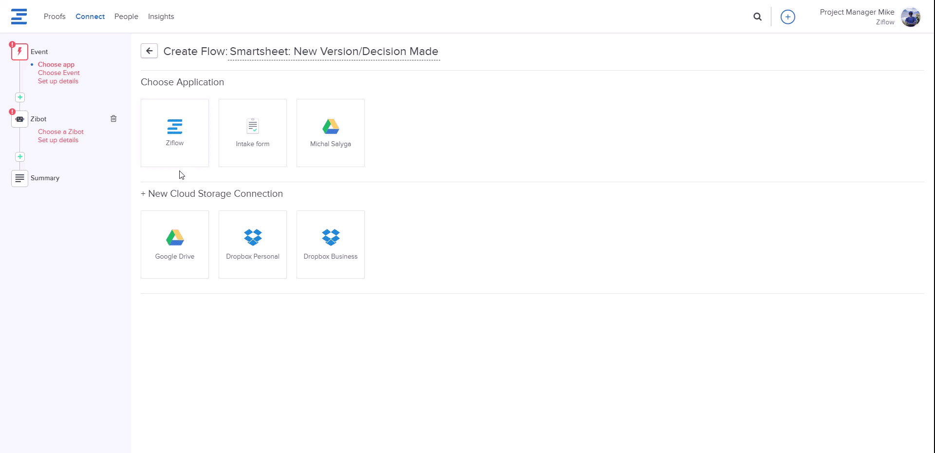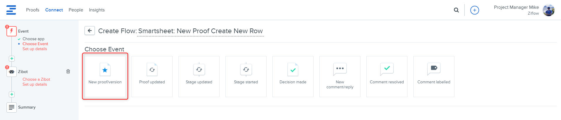 To integrate Smartsheet with Ziflow, you need to click on the Connect tab and then click on the + Create Flow button, choose Ziflow as the Application, and choose which Event (New proof/version, Decision made, New comment/reply, Comment resolved, Comment labeled) you want to trigger the integration.