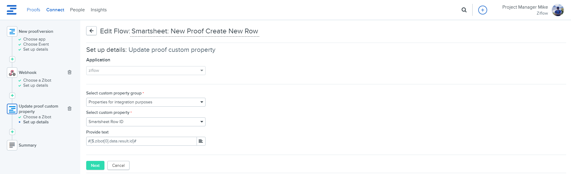This Zibot will get a Smartwsheet Row ID so you can store the value in a custom property and use it later to tell Ziflow which record should be updated when there are changes on the Ziflow side (new version or approval status).