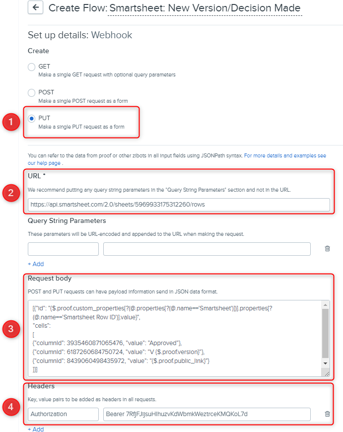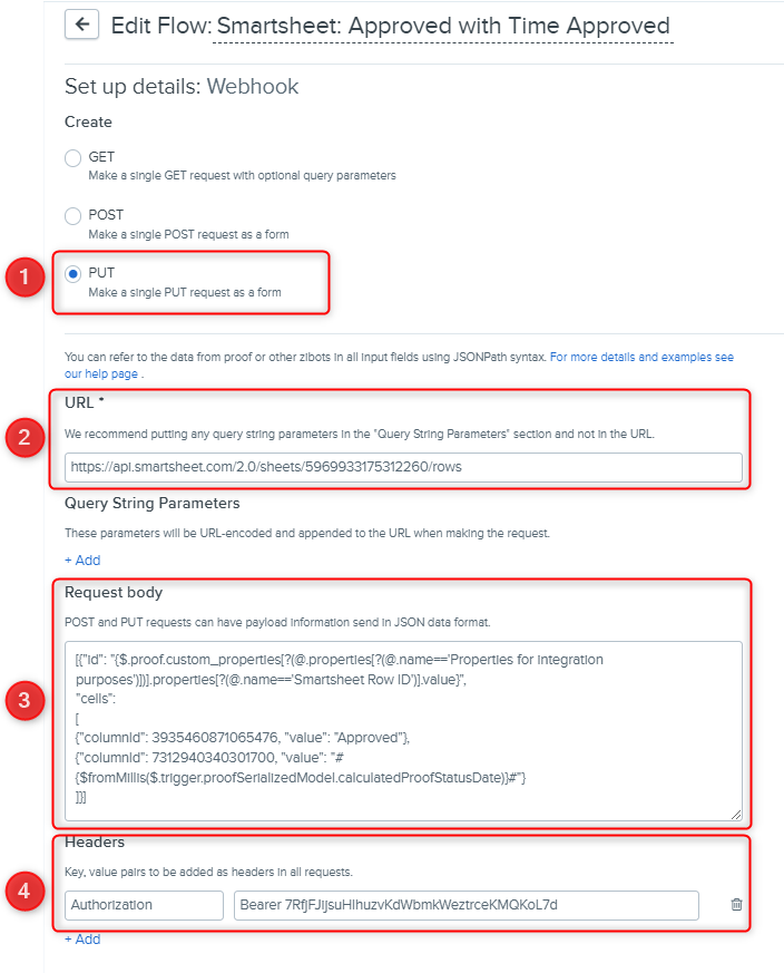 Request type - the PUT option should be selected as a request type since we want to update the Smatsheet row with information from Ziflow proof.