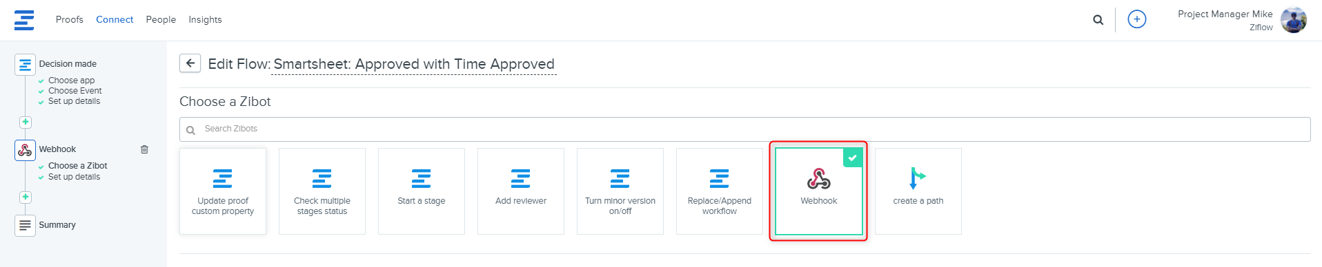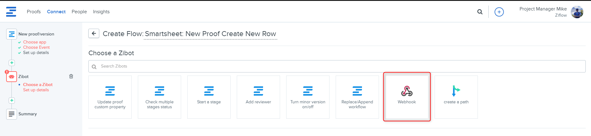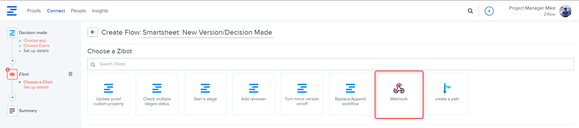 Fill out Webhook Zibot details; this Zibot will update a Smartsheet row when a proof decision is submitted in Ziflow.