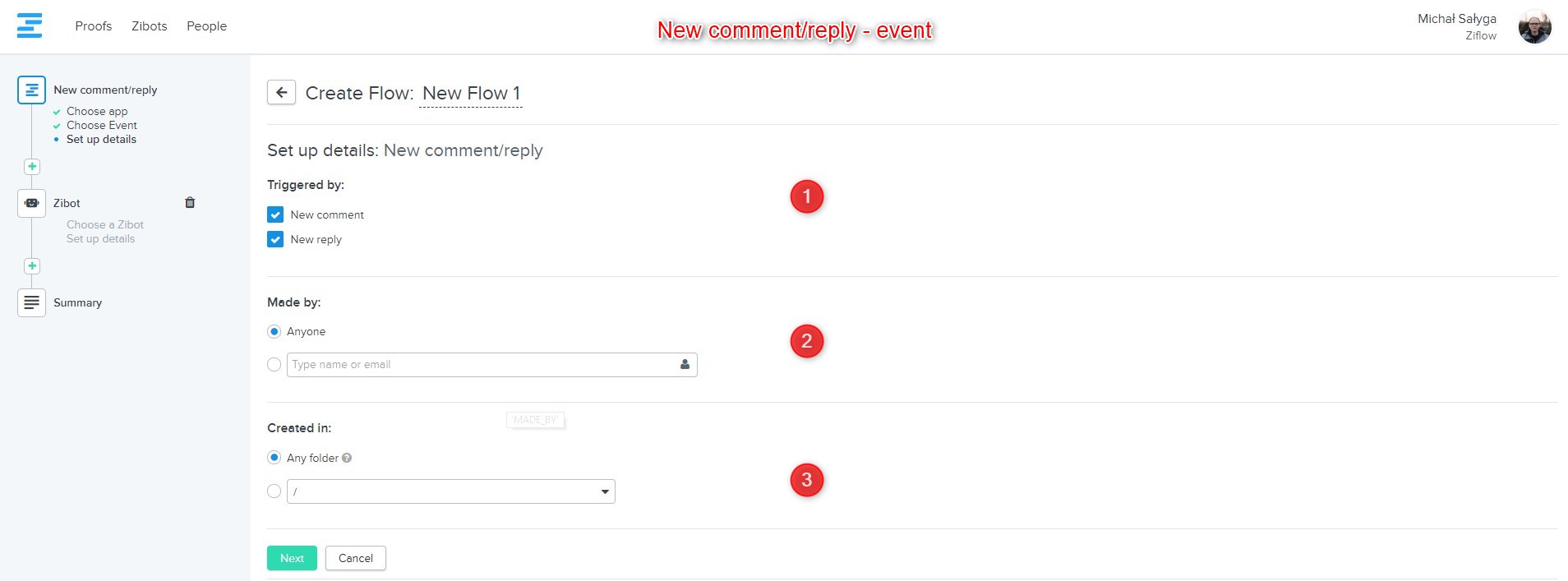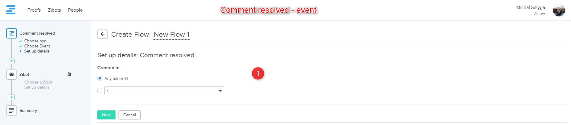 Created in - select the Ziflow folder that is going to be monitored by this flow.