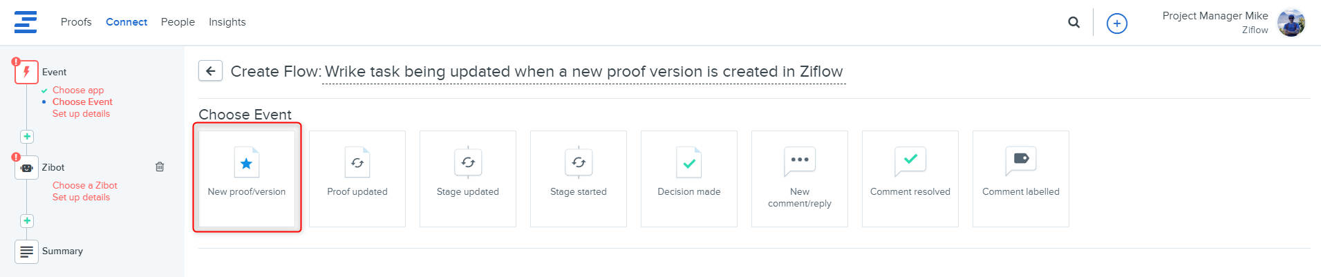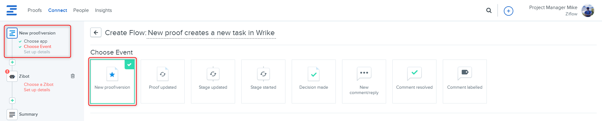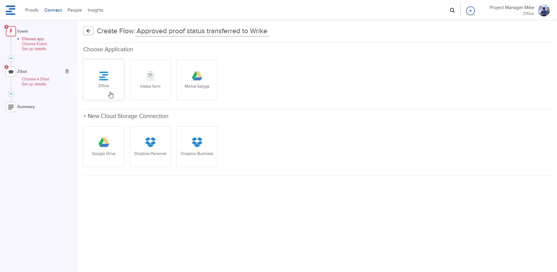 To integrate Wrike with Ziflow, you need to click on the Connect tab and then click on the +Create Flow button, choose Ziflow as the Application, and choose which Event (New proof/version, Decision made, New comment/reply, Comment resolved, Comment labeled) you want to trigger the integration.