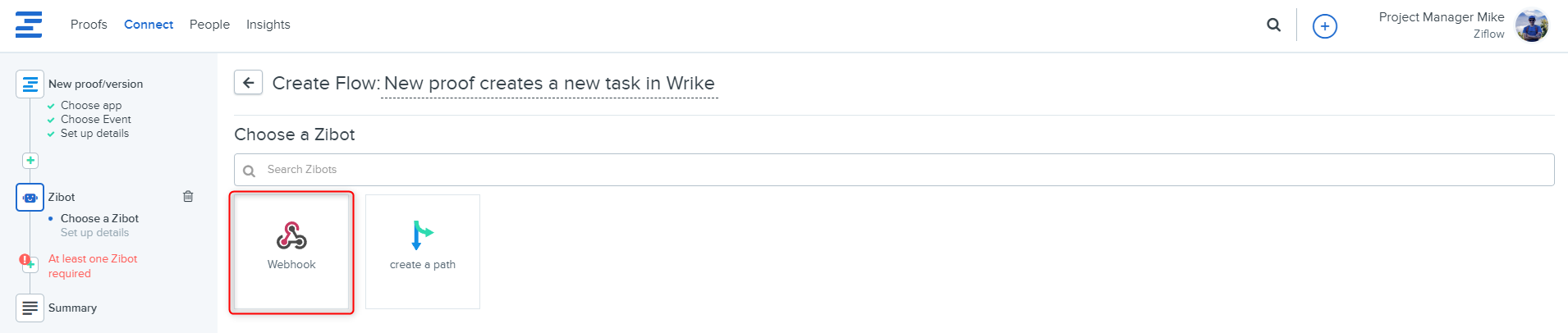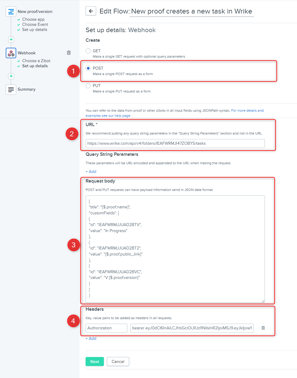 Fill out Webhook Zibot details; this Zibot will create a record in Wrike based on a Wrike Task ID property entered during proof creation.