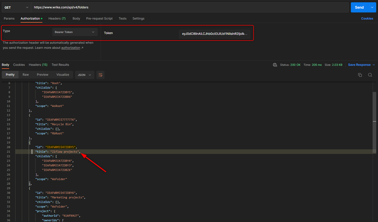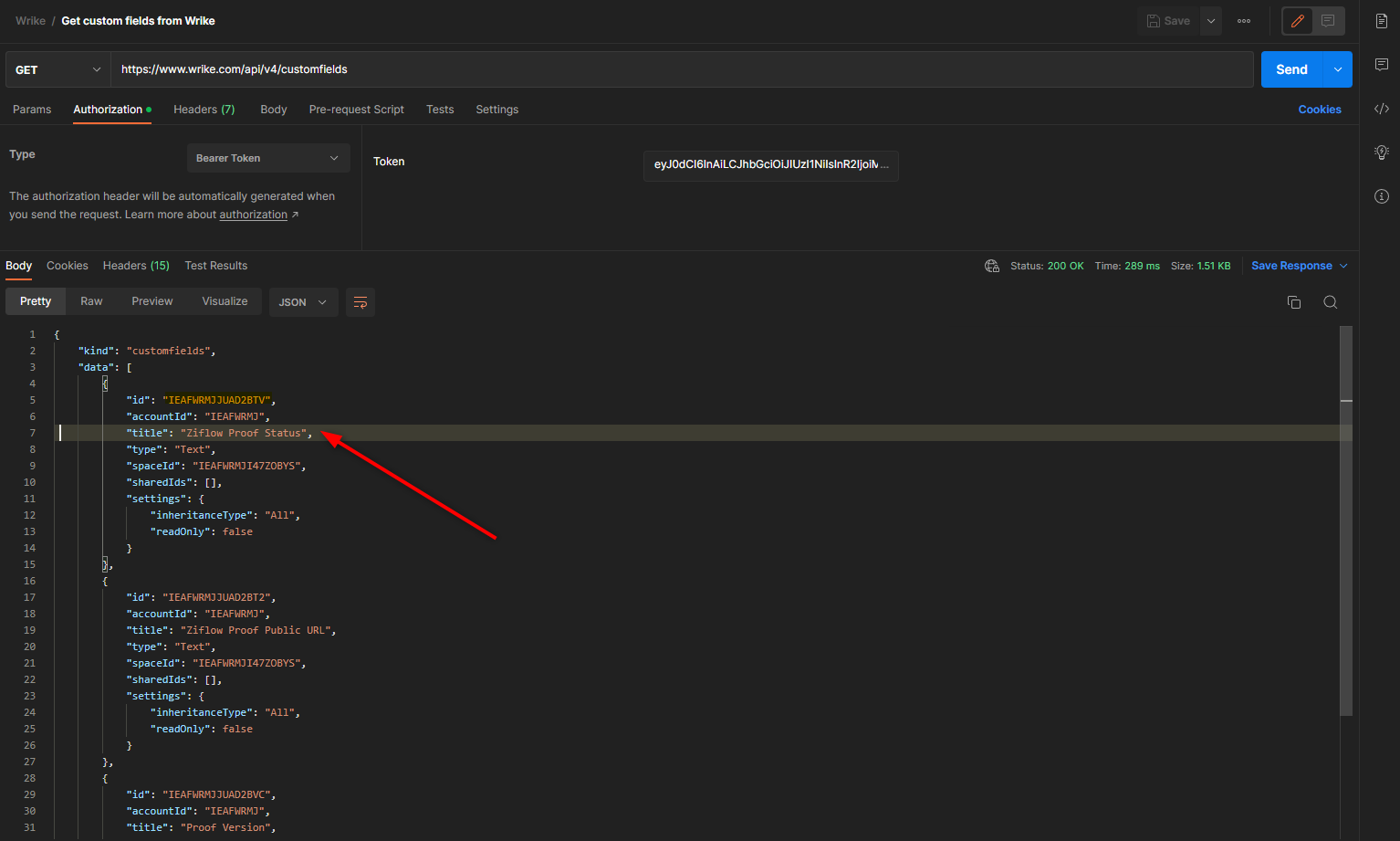 To get the IDs to use when referencing the different custom fields in Wrike to update, use this GET postman call. In my example, Ziflow Proof Status is IEAFWRMJJUAD2BTV, which was later used in the Body above when sending the public link token from Ziflow. You'll need to do the same for all Wrike fields that you want to update with information from Ziflow.