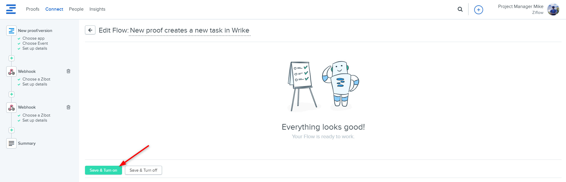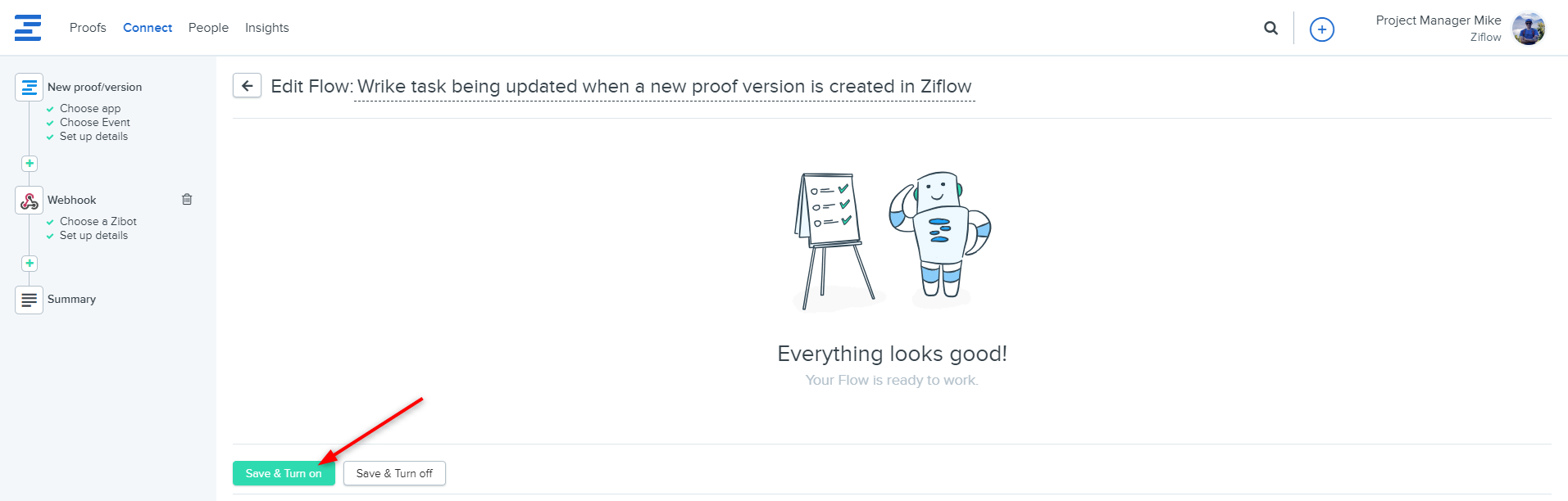 You can now test if the flow works correctly by submitting a proof decision on a sample proof in Ziflow and then checking if the flow has passed the correct proof status in the Wrike task.