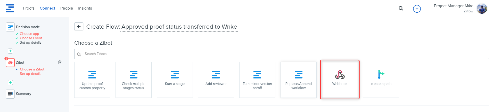 Fill out Webhook Zibot details; this Zibot will update the Wrike task status with a proof decision once it is calculated in Ziflow.