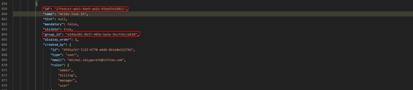 Request body - should be filled with JSON body referencing a custom property you created for Wrike Integration.