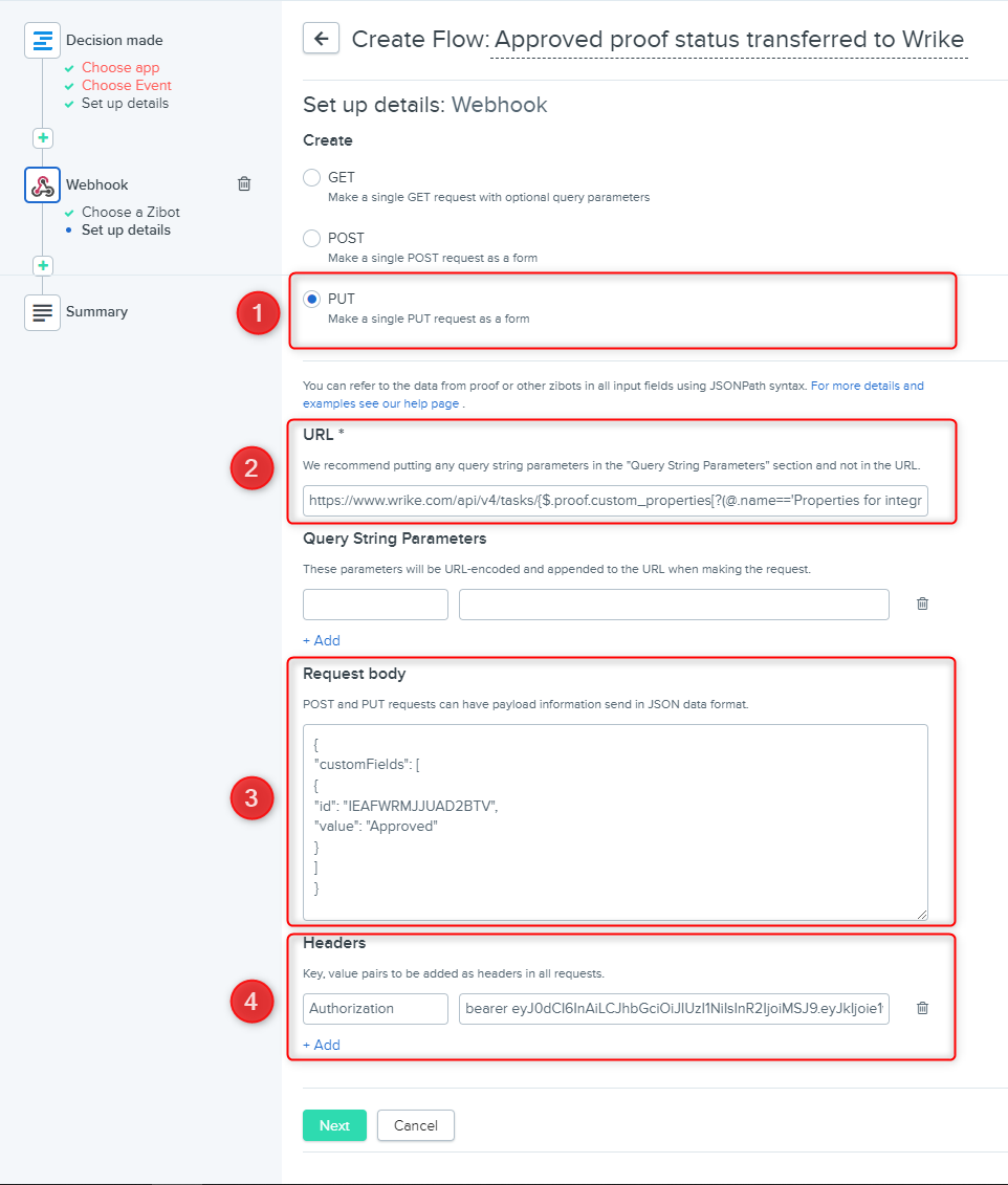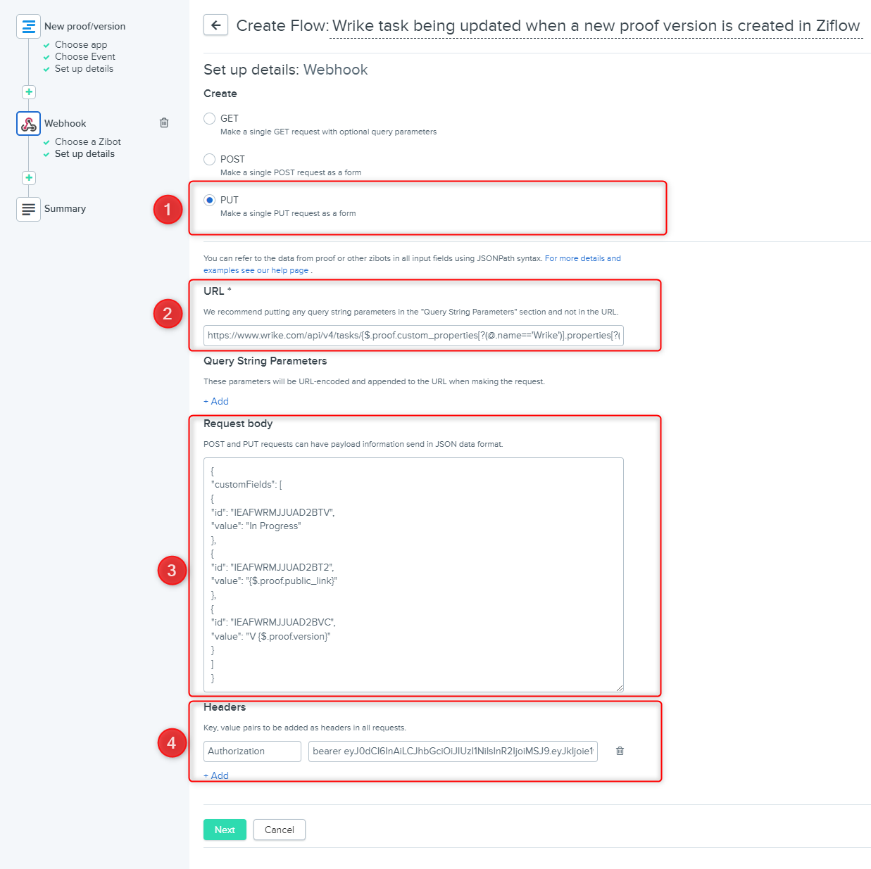 Request type - the PUT option should be selected as a request type since we want to update the Wrike task with information from Ziflow proof.