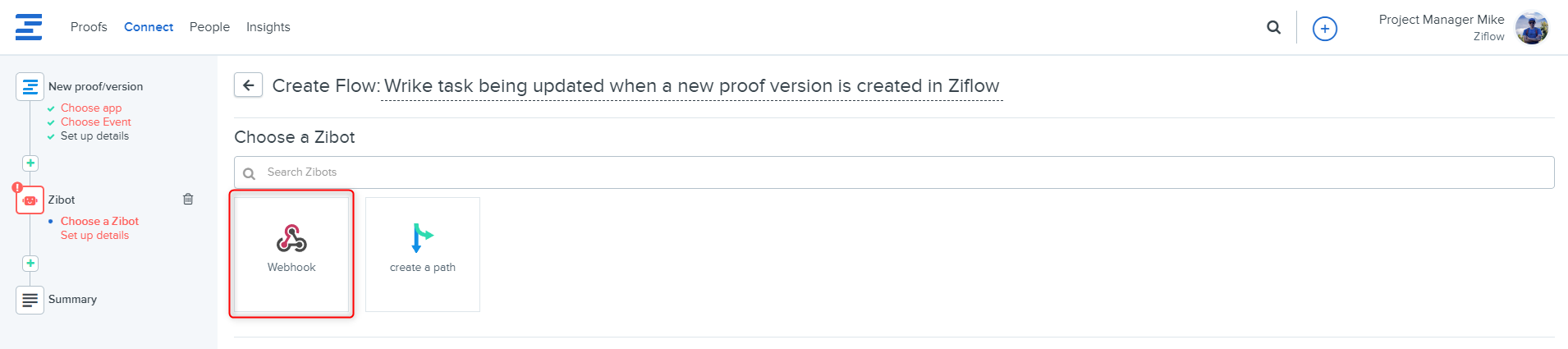 Once you have collected property details, add a new Webhook Zibot to your flow. This Zibot will get a Wrike task ID from Wrike so that you can store that value in a custom property and use it to tell Ziflow which task to update when there are updates from the Ziflow side (new version or approval status).