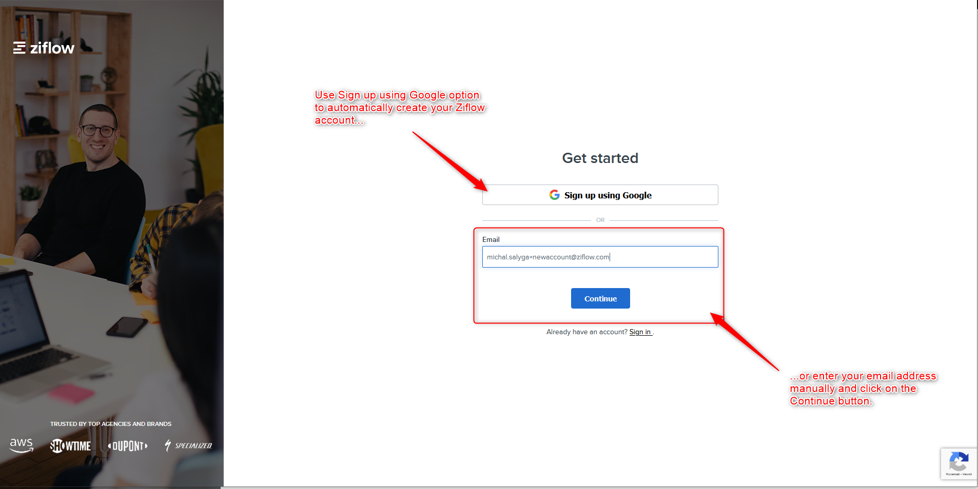 - Click Sign up using Google to automatically create your account using Google data or fill out the email field manually with your email address and select Continue.