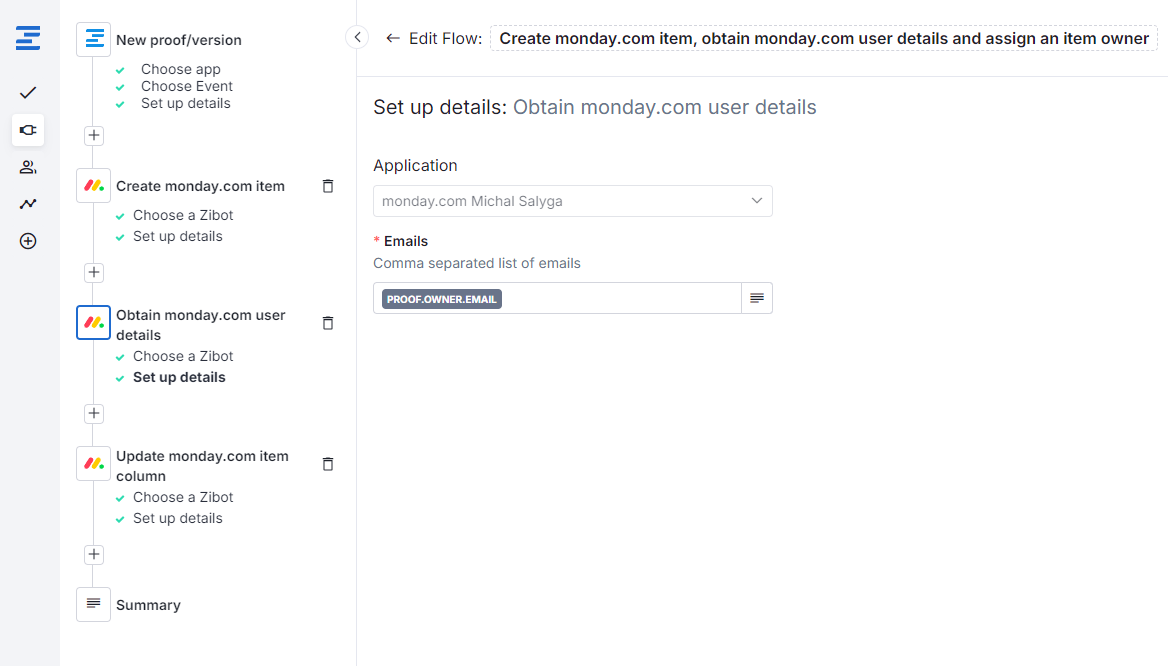 When a proof is created in Ziflow and a corresponding task is automatically generated in monday.com, the Zibot will retrieve the monday.com user ID so you can assign the task to the proof owner.