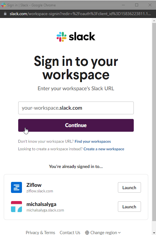 Step 1: You will be asked for your Slack URL and then asked to log in to Slack using your credentials.