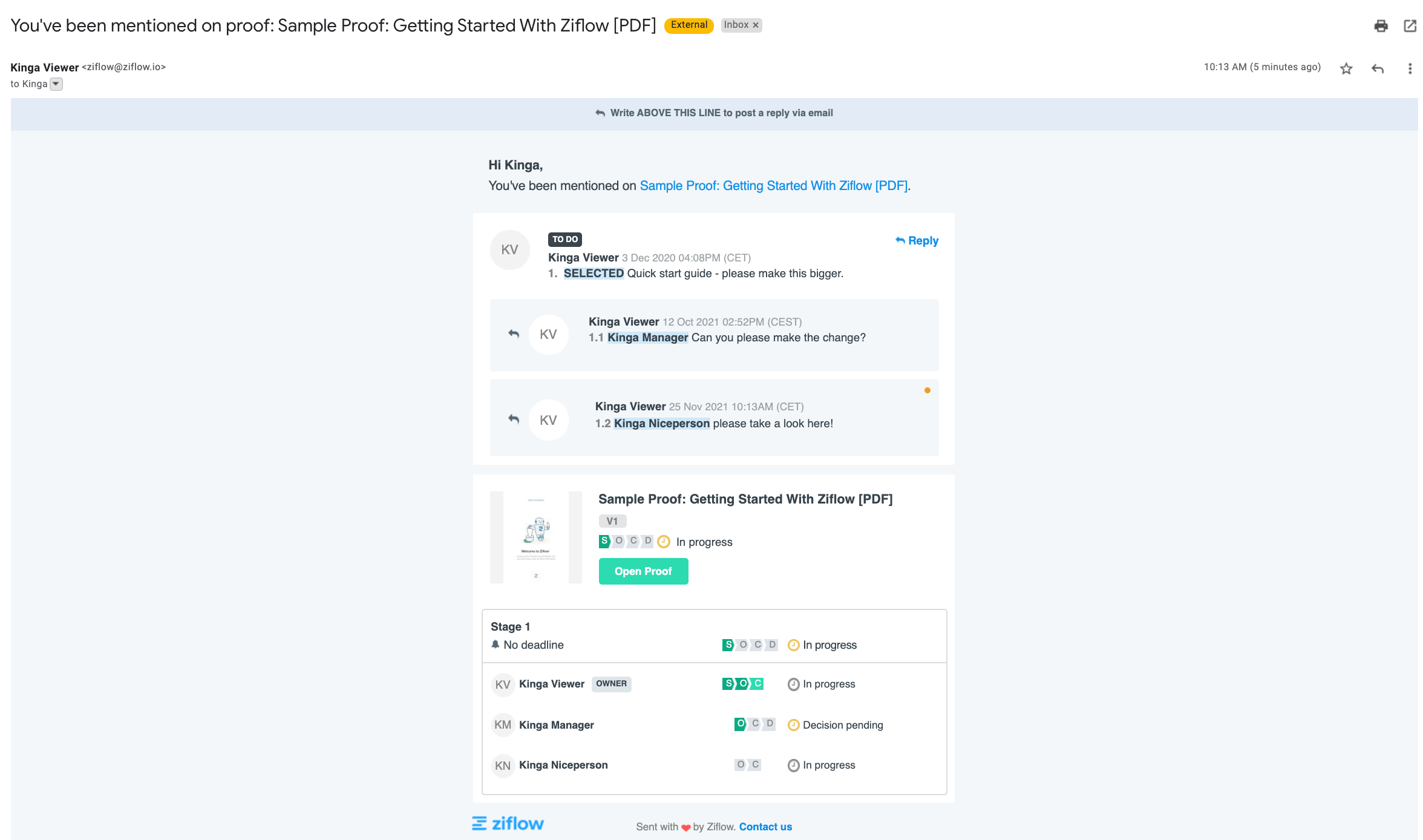 Ziflow then sends the tagged reviewer an email notification containing your comment and proof details.