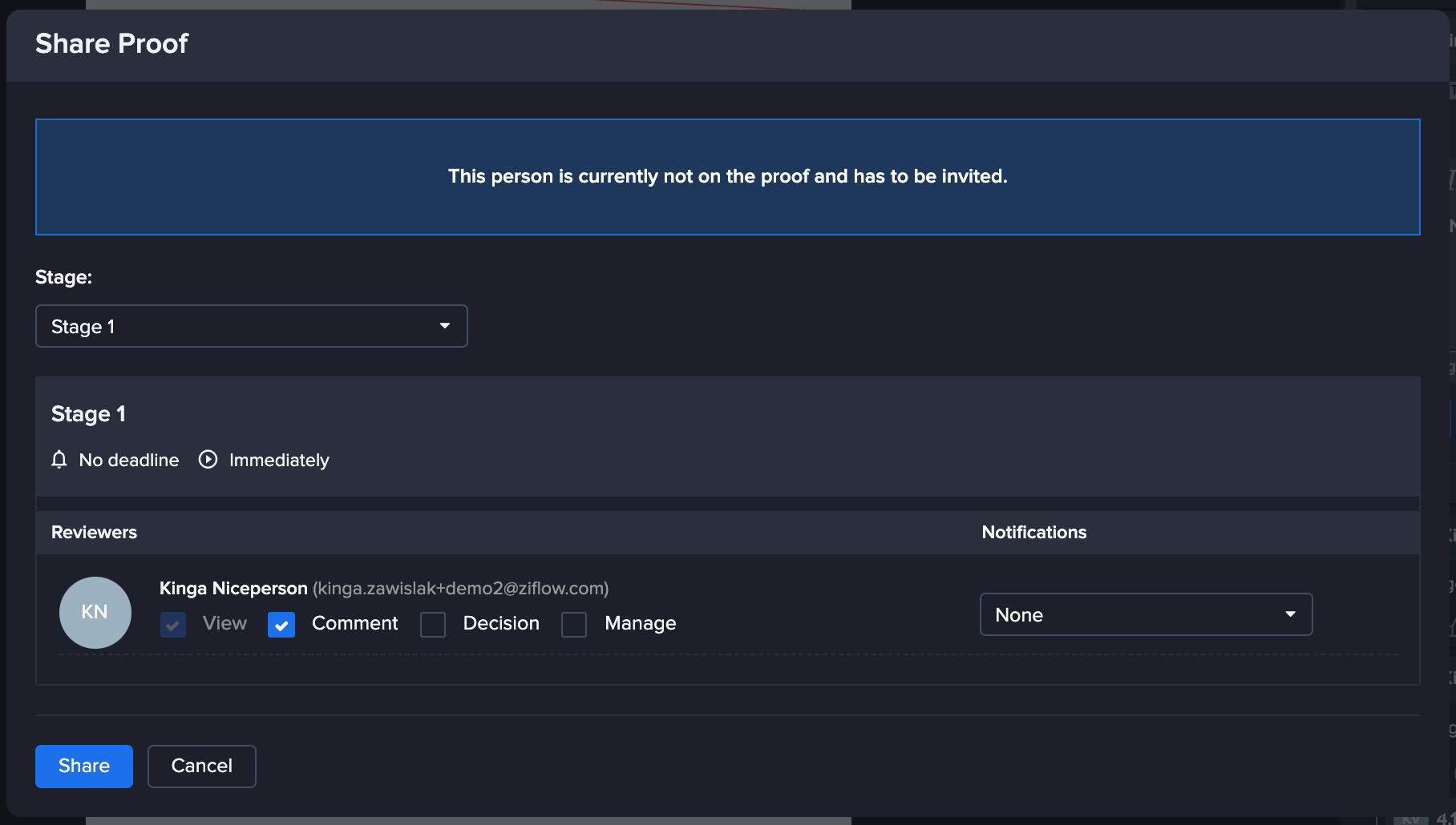 - Ziflow will prompt you to share the proof and assign that person to a stage.